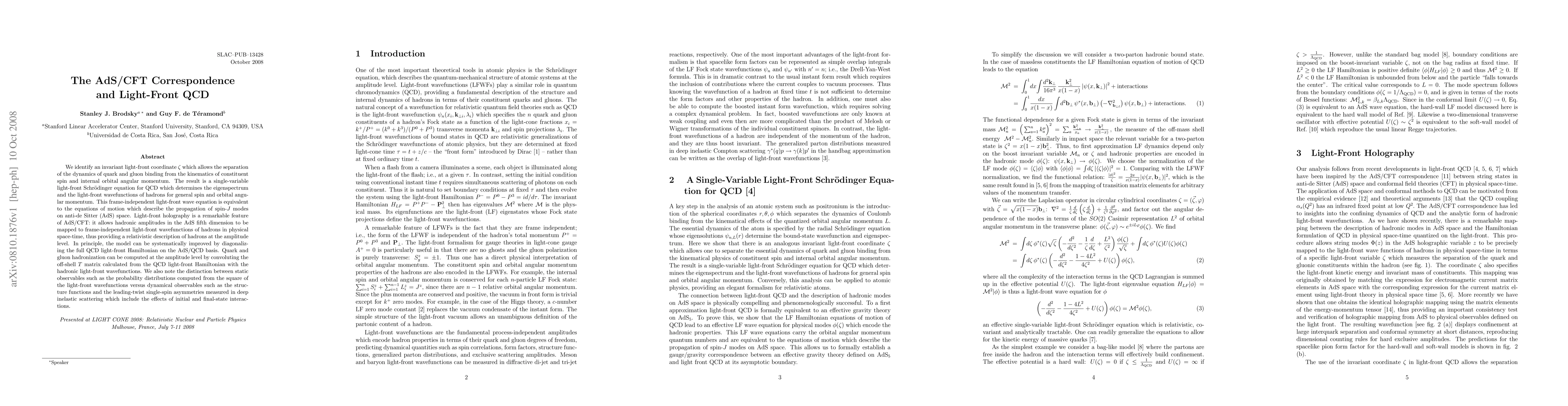 The paper presents a light-front Schrödinger equation for QCD, linking dynamics and kinematics, and shows it is equivalent to equations describing spin-$J$ modes on AdS space, utilizing AdS/CFT correspondence for light-front holography. It distinguishes static and dynamical observables in hadron physics.