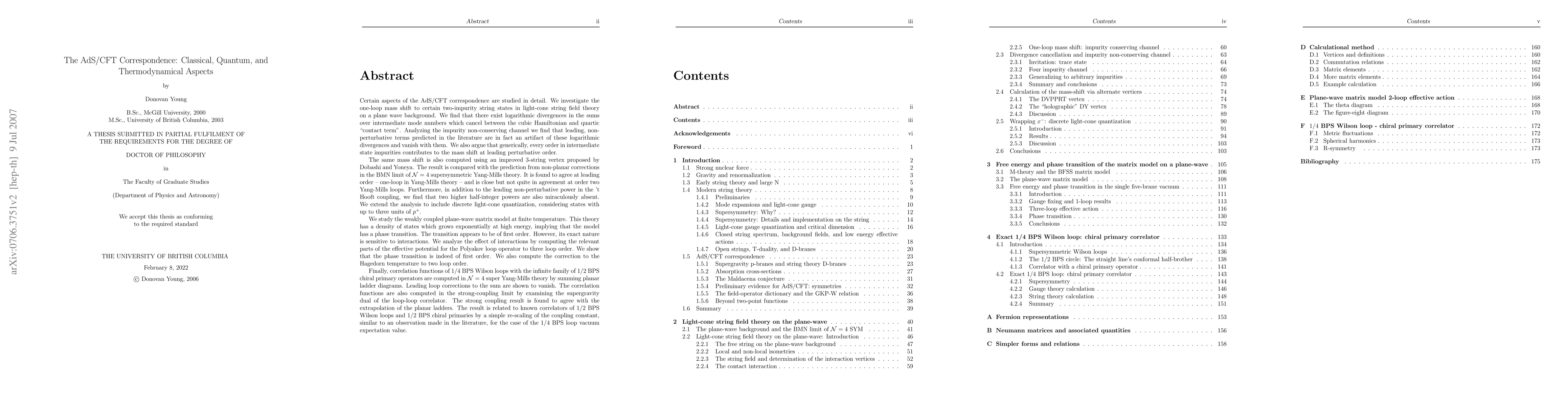 Certain aspects of the AdS/CFT correspondence are studied in detail. We investigate the one-loop mass shift to certain two-impurity string states in light-cone string field theory on a plane wave background. We find that there exist logarithmic divergences in the sums over intermediate mode numbers which cancel between the cubic Hamiltonian and quartic "contact term". We argue that generically, every order in intermediate state impurities contributes to the mass shift at leading perturbative order. The same mass shift is also computed using an improved 3-string vertex proposed by Dobashi and Yoneya. The result is found to agree with gauge theory at leading order and is close but not quite in agreement at subleading order. We extend the analysis to include discrete light-cone quantization, considering states with up to three units of p+. We study the (apparently) first-order phase transition in the weakly coupled plane-wave matrix model at finite temperature. We analyze the effect of interactions by computing the relevant parts of the effective potential for the Polyakov loop operator to three loop order. We show that the phase transition is indeed of first order. We also compute the 2-loop correction to the Hagedorn temperature. Finally, correlation functions of 1/4 BPS Wilson loops with the infinite family of 1/2 BPS chiral primary operators are computed in N=4 super Yang-Mills theory by summing planar ladder diagrams. The correlation functions are also computed in the strong-coupling limit using string theory; the result is found to agree with the extrapolation of the planar ladders. The result is related to similar correlators of 1/2 BPS loops by a simple re-scaling of the coupling constant, discovered by Drukker for the case of the 1/4 BPS loop VEV.