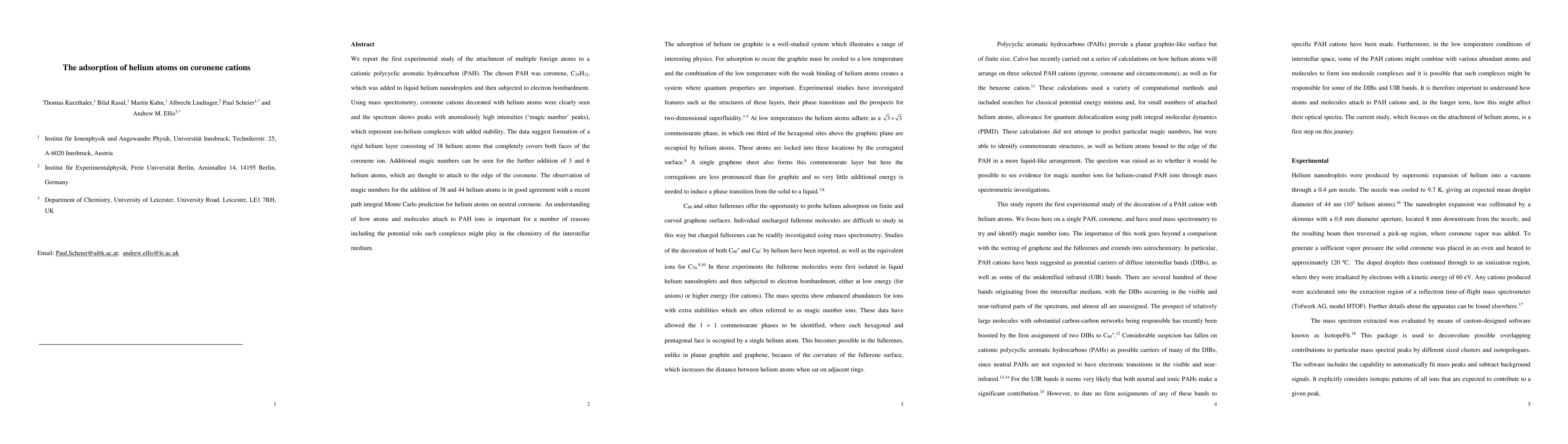 This study experimentally investigates the adsorption of helium atoms onto coronene cations, revealing "magic number" peaks indicating enhanced stability for specific helium atom counts. The findings suggest a rigid helium layer of 38 atoms covering coronene cations, with additional helium atoms attaching to the edges, providing insights into PAH ion chemistry relevant to interstellar medium processes.