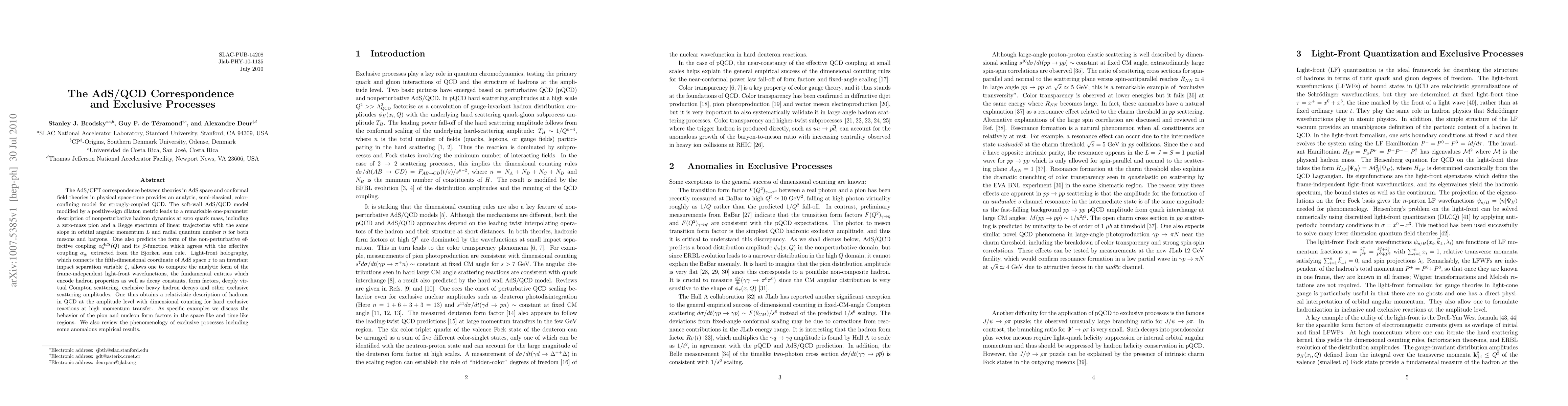 The AdS/CFT correspondence between theories in AdS space and conformal field theories in physical space-time provides an analytic, semi-classical, color-confining model for strongly-coupled QCD. The soft-wall AdS/QCD model modified by a positive-sign dilaton metric leads to a remarkable one-parameter description of nonperturbative hadron dynamics at zero quark mass, including a zero-mass pion and a Regge spectrum of linear trajectories with the same slope in orbital angular momentum $L$ and radial quantum number $n$ for both mesons and baryons. One also predicts the form of the non-perturbative effective coupling $\alpha_s^{AdS}(Q)$ and its $\beta$-function which agrees with the effective coupling $\alpha_{g_1}$ extracted from the Bjorken sum rule. Light-front holography, which connects the fifth-dimensional coordinate of AdS space $z$ to an invariant impact separation variable $\zeta$, allows one to compute the analytic form of the frame-independent light-front wavefunctions, the fundamental entities which encode hadron properties as well as decay constants, form factors, deeply virtual Compton scattering, exclusive heavy hadron decays and other exclusive scattering amplitudes. One thus obtains a relativistic description of hadrons in QCD at the amplitude level with dimensional counting for hard exclusive reactions at high momentum transfer. As specific examples we discuss the behavior of the pion and nucleon form factors in the space-like and time-like regions. We also review the phenomenology of exclusive processes including some anomalous empirical results.