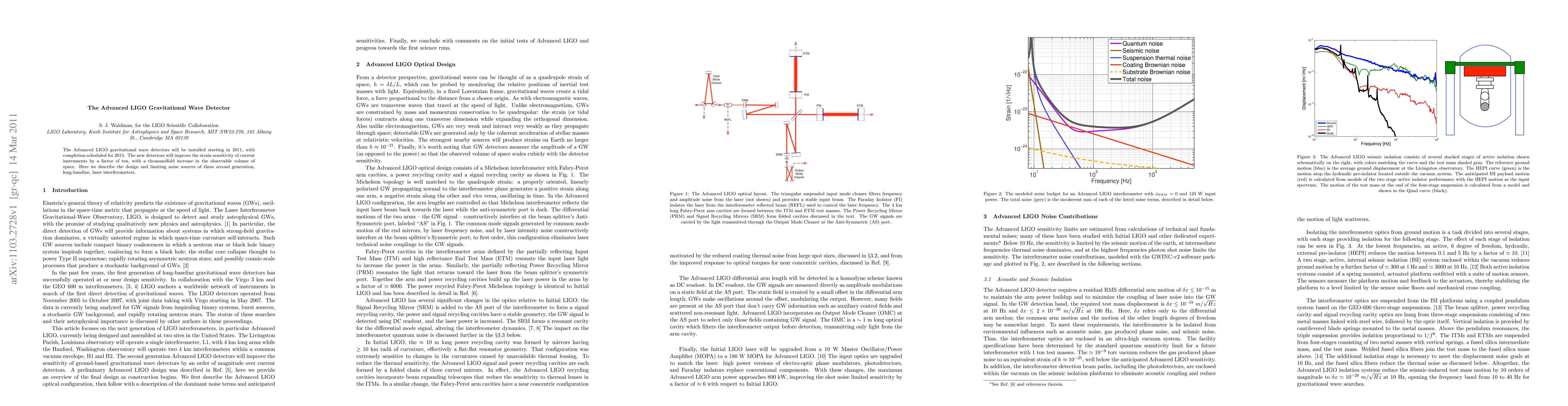 Summary: The Advanced LIGO gravitational wave detectors, set to be completed by 2015, aim to enhance the sensitivity of current instruments by a factor of ten, expanding the observable volume of space a thousandfold. This paper details the design and noise limitations of these second-generation laser interferometers.