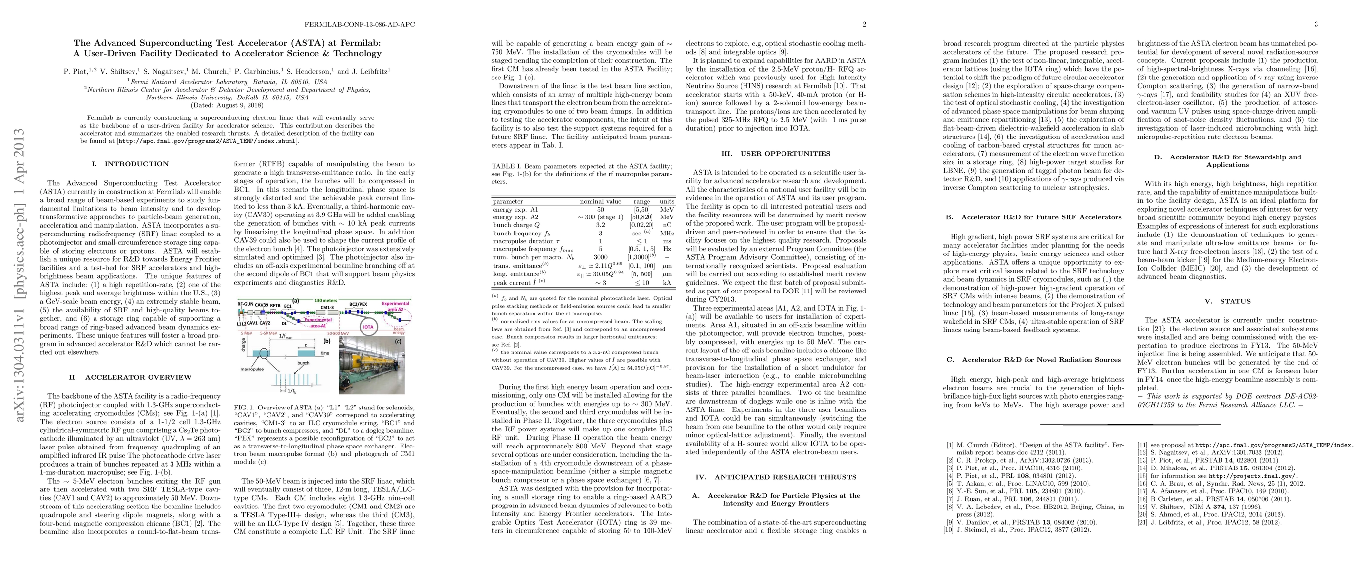 The Advanced Superconducting Test Accelerator (ASTA) at Fermilab is a user-driven facility dedicated to advancing accelerator science and technology, utilizing a superconducting electron linac to enable various research initiatives. Detailed information on the facility is available at the provided URL.