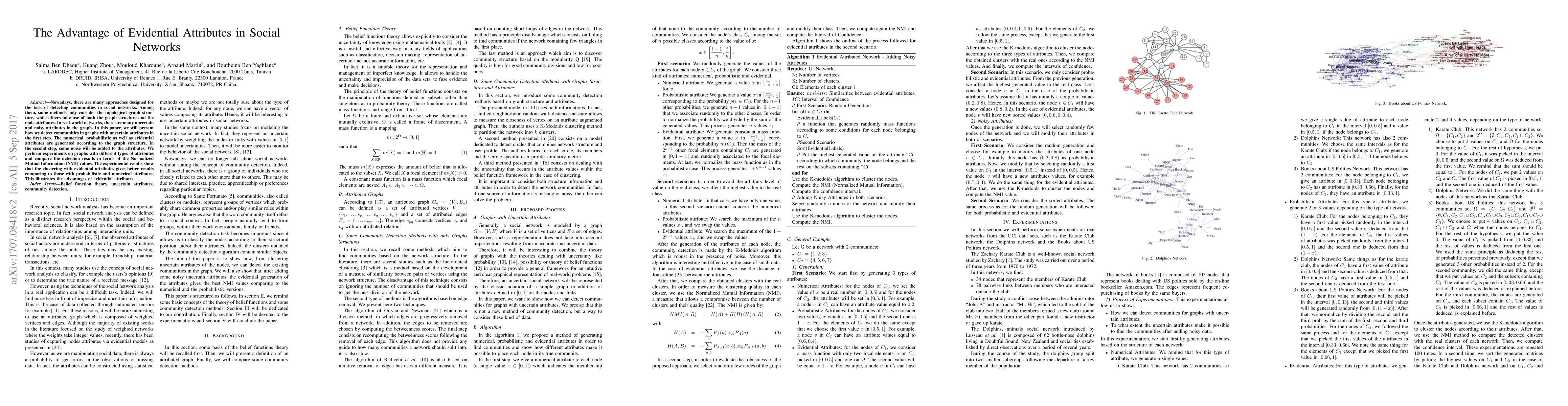 This paper investigates community detection in social networks using evidential attributes, demonstrating that they outperform probabilistic and numerical attributes in clustering accuracy, as shown by higher Normalized Mutual Information (NMI) values in experiments.