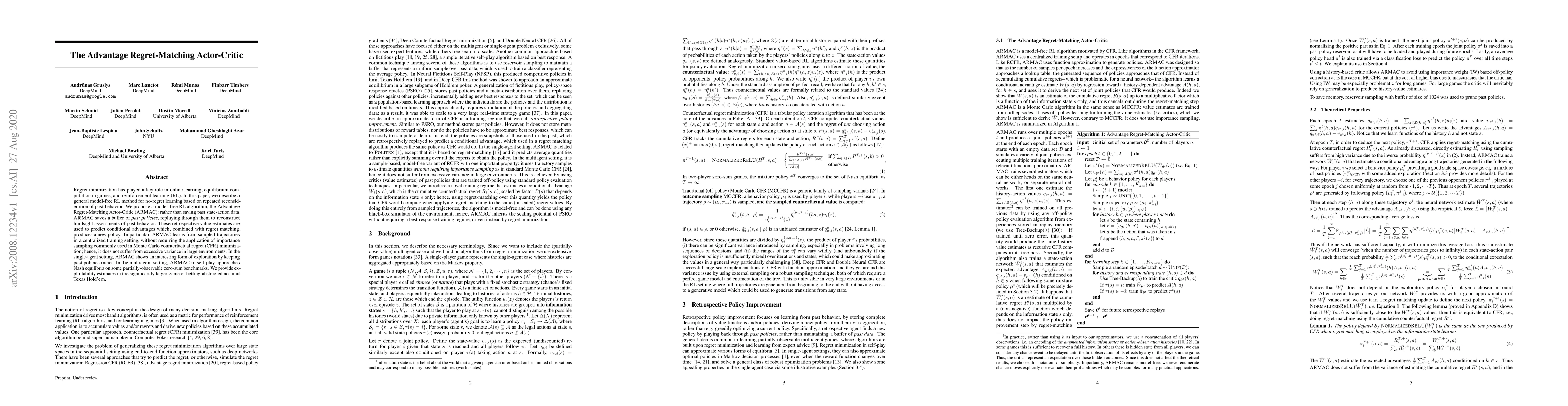 The paper proposes the AdvantageRegret-Matching Actor-Critic (ARMAC) algorithm, a model-free reinforcement learning method that leverages past policies for no-regret learning, showing effective exploration and convergence to Nash equilibria in multiagent settings. ARMAC avoids the variance issues of importance sampling, making it suitable for large environments.