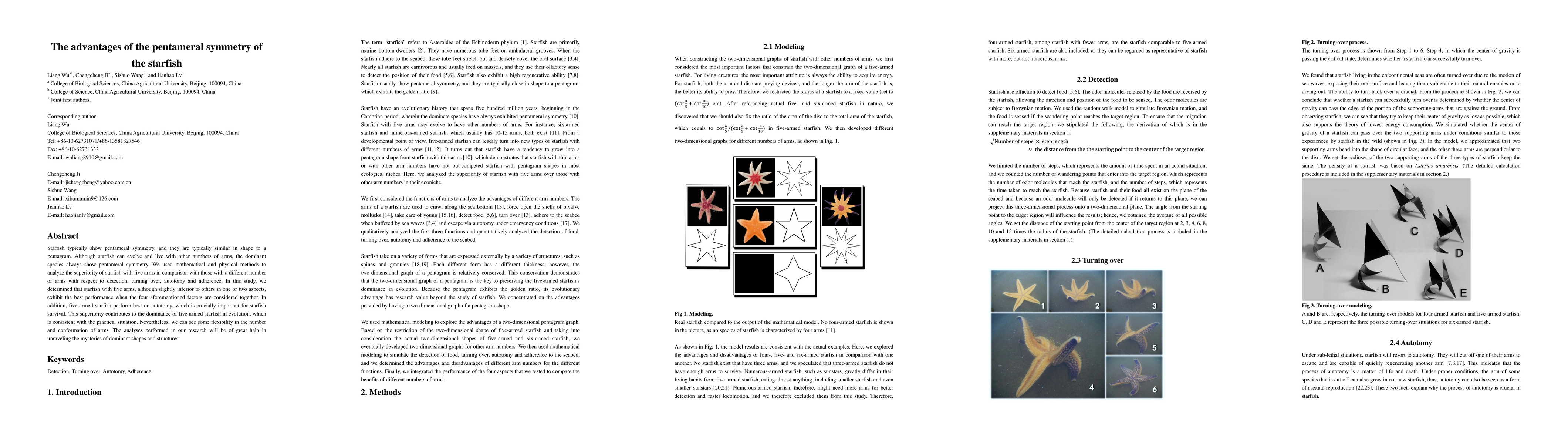 Starfish typically show pentameral symmetry, and they are typically similar in shape to a pentagram. Although starfish can evolve and live with other numbers of arms, the dominant species always show pentameral symmetry. We used mathematical and physical methods to analyze the superiority of starfish with five arms in comparison with those with a different number of arms with respect to detection, turning over, autotomy and adherence. In this study, we determined that starfish with five arms, although slightly inferior to others in one or two aspects, exhibit the best performance when the four aforementioned factors are considered together. In addition, five-armed starfish perform best on autotomy, which is crucially important for starfish survival. This superiority contributes to the dominance of five-armed starfish in evolution, which is consistent with the practical situation. Nevertheless, we can see some flexibility in the number and conformation of arms. The analyses performed in our research will be of great help in unraveling the mysteries of dominant shapes and structures.
