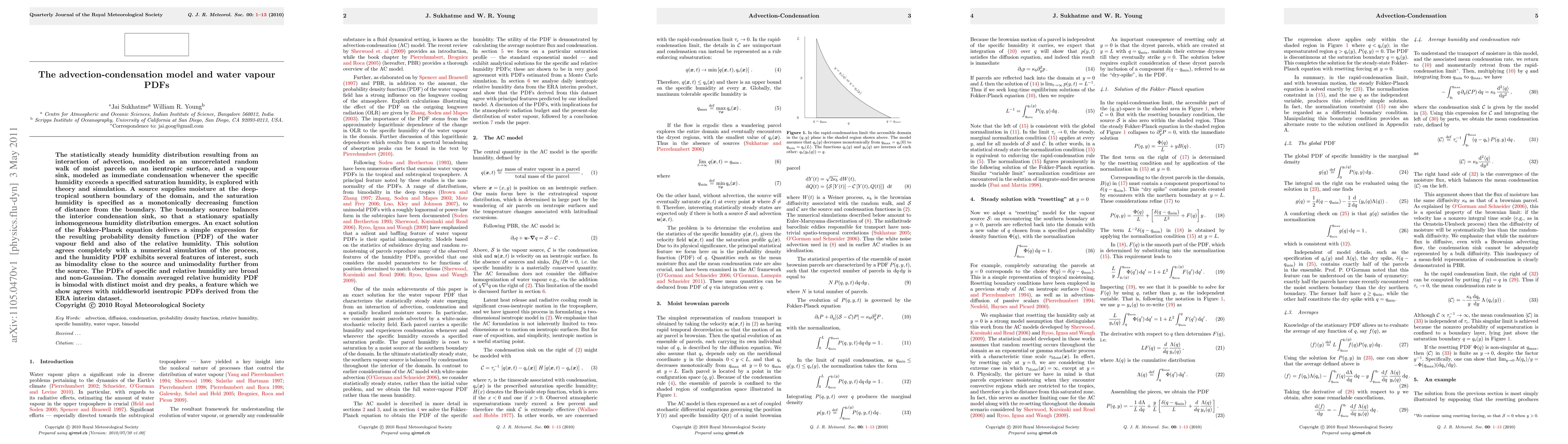 The statistically steady humidity distribution resulting from an interaction of advection, modeled as an uncorrelated random walk of moist parcels on an isentropic surface, and a vapour sink, modeled as immediate condensation whenever the specific humidity exceeds a specified saturation humidity, is explored with theory and simulation. A source supplies moisture at the deep-tropical southern boundary of the domain, and the saturation humidity is specified as a monotonically decreasing function of distance from the boundary. The boundary source balances the interior condensation sink, so that a stationary spatially inhomogeneous humidity distribution emerges. An exact solution of the Fokker-Planck equation delivers a simple expression for the resulting probability density function (PDF) of the water vapour field and also of the relative humidity. This solution agrees completely with a numerical simulation of the process, and the humidity PDF exhibits several features of interest, such as bimodality close to the source and unimodality further from the source. The PDFs of specific and relative humidity are broad and non-Gaussian. The domain averaged relative humidity PDF is bimodal with distinct moist and dry peaks, a feature which we show agrees with middleworld isentropic PDFs derived from the ERA interim dataset.