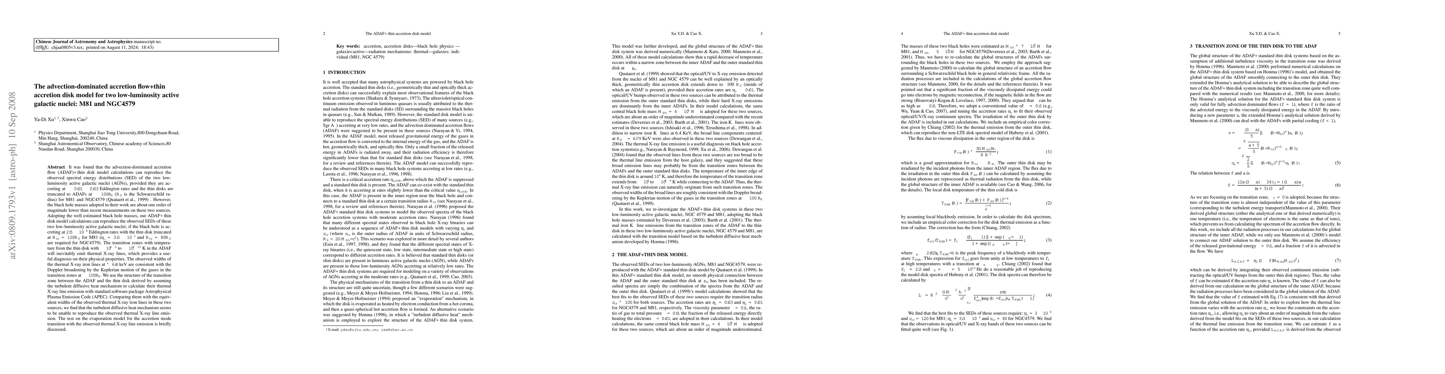 It was found that the advection-dominated accretion flow (ADAF)+thin disk model calculations can reproduce the observed spectral energy distributions (SED) of the two low luminosity AGN, provided they are accreting at ~0.01-0.03 Eddington rates and the thin disks are truncated to ADAFs at ~100 R_s (Schwarzschild radii) for M81 and NGC4579 (Quataert et al., 1999). However, the black hole masses adopted in their work are about one order of magnitude lower than recent measurements on these two sources. Adopting the well estimated black hole masses, our ADAF+thin disk model calculations can reproduce the observed SEDs of these two LLAGN, if the black hole is accreting at 2.5e-4 Eddington rates with the thin disk truncated at 120 R_s for M81 (3.3e-3 and R_tr = 80R_s are required for NGC4579). The observed widths of the thermal X-ray iron lines at 6.8 keV are consistent with the Doppler broadening by the Keplerian motion of the gases in the transition zones at ~100R_s. The observed thermal X-ray lines provide a useful diagnosis on the physical properties of the transition zones. We calculate the thermal X-ray line emission from the transition zone between the ADAF and the thin disk with standard software package Astrophysical Plasma Emission Code (APEC), and the physical implications on the models of the transition zones are discussed.