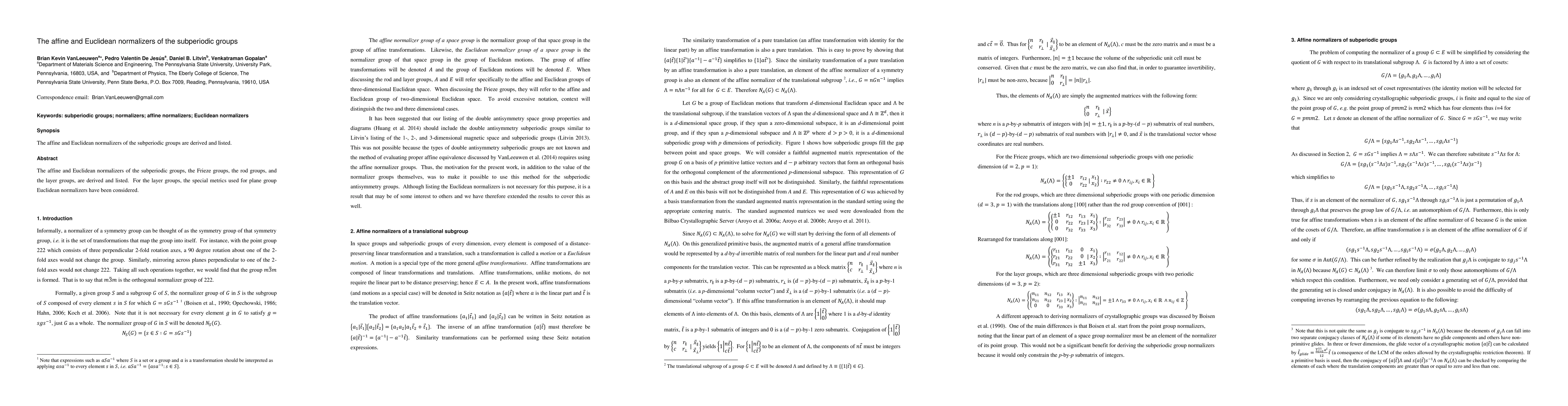 This paper derives and lists the affine and Euclidean normalizers of subperiodic groups, including Frieze, rod, and layer groups, with special metrics applied for plane group Euclidean normalizers in the case of layer groups.