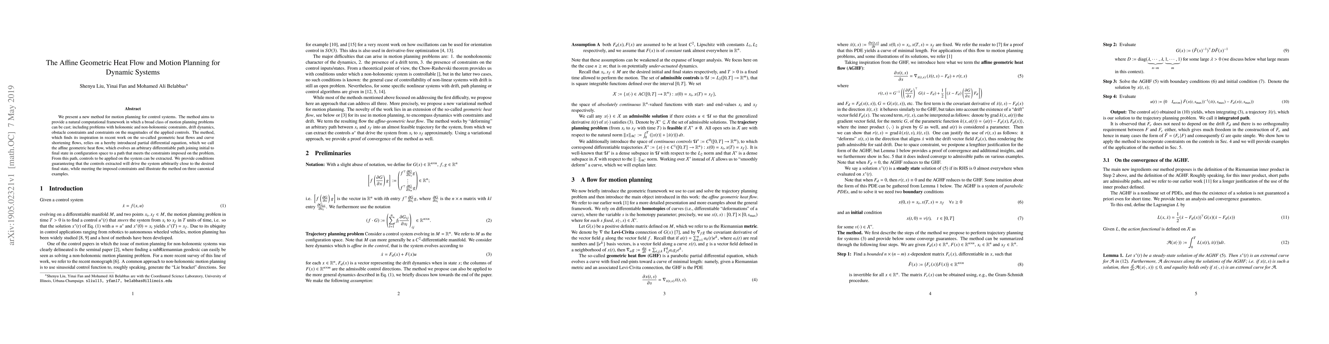 We present a new method for motion planning for control systems. The method aims to provide a natural computational framework in which a broad class of motion planning problems can be cast; including problems with holonomic and non-holonomic constraints, drift dynamics, obstacle constraints and constraints on the magnitudes of the applied controls. The method, which finds its inspiration in recent work on the so-called geometric heat flows and curve shortening flows, relies on a hereby introduced partial differential equation, which we call the affine geometric heat flow, which evolves an arbitrary differentiable path joining initial to final state in configuration space to a path that meets the constraints imposed on the problem. From this path, controls to be applied on the system can be extracted. We provide conditions guaranteeing that the controls extracted will drive the system arbitrarily close to the desired final state, while meeting the imposed constraints and illustrate the method on three canonical examples.