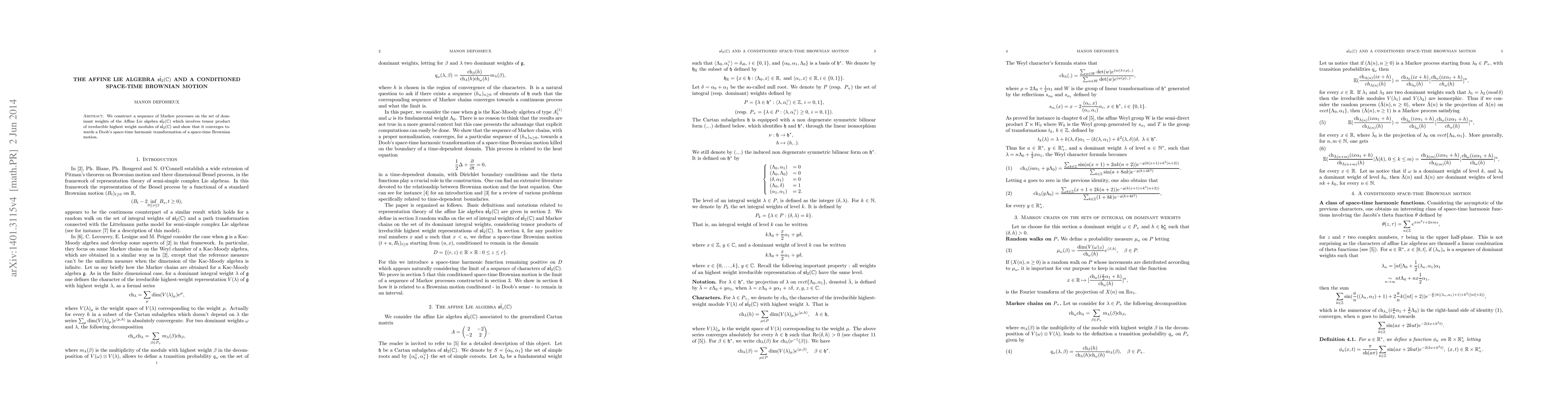 Summary: This research constructs Markov processes on dominant weights of the affine Lie algebra $\hat{\mathfrak{sl}_2}(\C)$, demonstrating their convergence to a Doob's space-time harmonic transformation of a conditioned space-time Brownian motion. The process involves tensor products of irreducible highest weight modules.