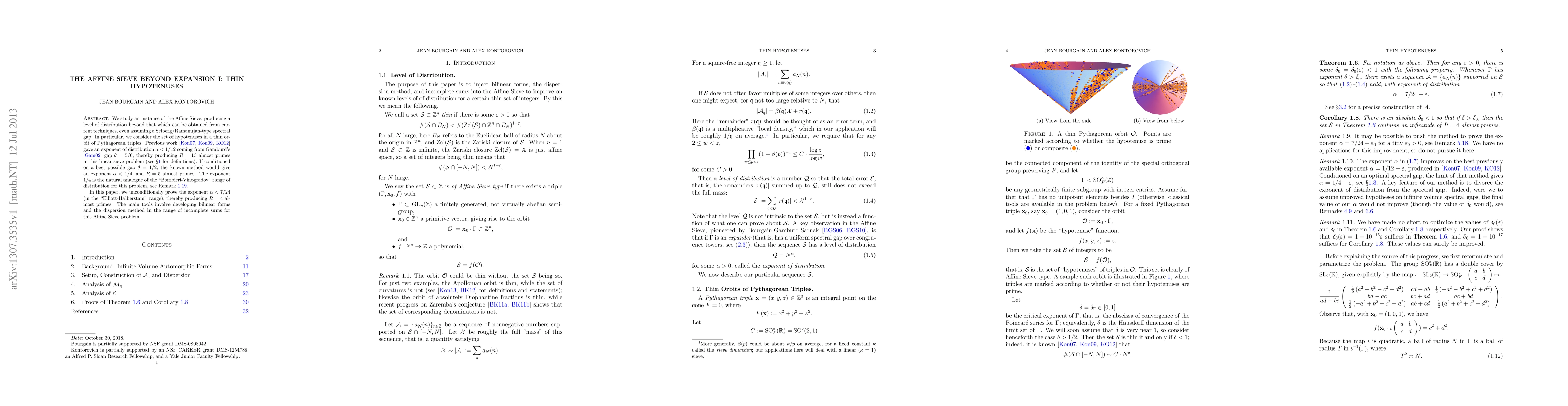 We study an instance of the Affine Sieve, producing a level of distribution beyond that which can be obtained from current techniques, even assuming a Selberg/Ramanujan-type spectral gap. In particular, we consider the set of hypotenuses in a thin orbit of Pythagorean triples. Previous work [Kon07, Kon09, KO12] gave an exponent of distribution alpha < 1/12 coming from Gamburd's [Gam02] gap theta = 5/6, thereby producing R = 13 almost primes in this linear sieve problem (see Sec. 1 for definitions). If conditioned on a best possible gap theta = 1/2, the known method would give an exponent alpha < 1/4, and R = 5 almost primes. The exponent 1/4 is the natural analogue of the "Bombieri-Vinogradov" range of distribution for this problem, see Remark 1.19. In this paper, we unconditionally prove the exponent alpha < 7/24 (in the "Elliott-Halberstam" range), thereby producing R = 4 almost primes. The main tools involve developing bilinear forms and the dispersion method in the range of incomplete sums for this Affine Sieve problem.