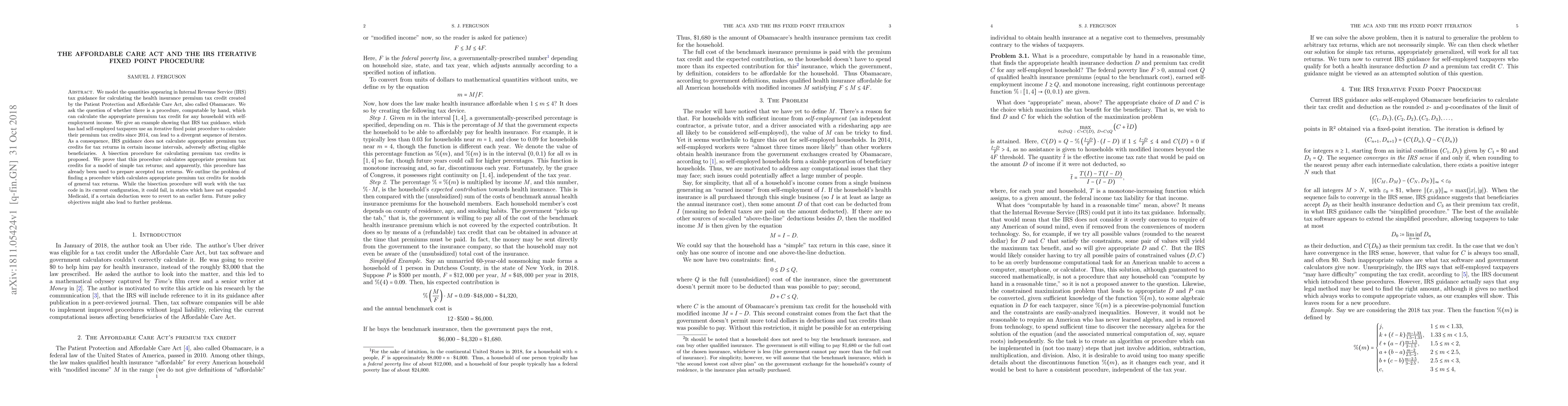 This paper models IRS tax guidance for calculating health insurance premium tax credits under the Affordable Care Act and identifies flaws in the current iterative fixed point procedure, leading to incorrect tax credits for some self-employed individuals. It proposes a bisection method as a more reliable alternative, though it notes potential future complications due to policy changes.