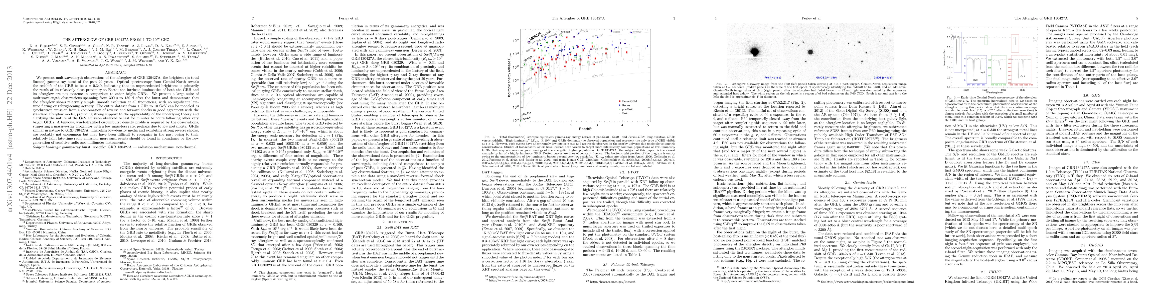This paper presents multiwavelength observations of the afterglow of GRB 130427A, revealing its redshift at z=0.340 and demonstrating simple, smooth evolution without significant late-time activity. The data supports synchrotron emission models and suggests a massive-star progenitor with low mass-loss rate, indicating that similar GRBs may be more common than previously recognized.