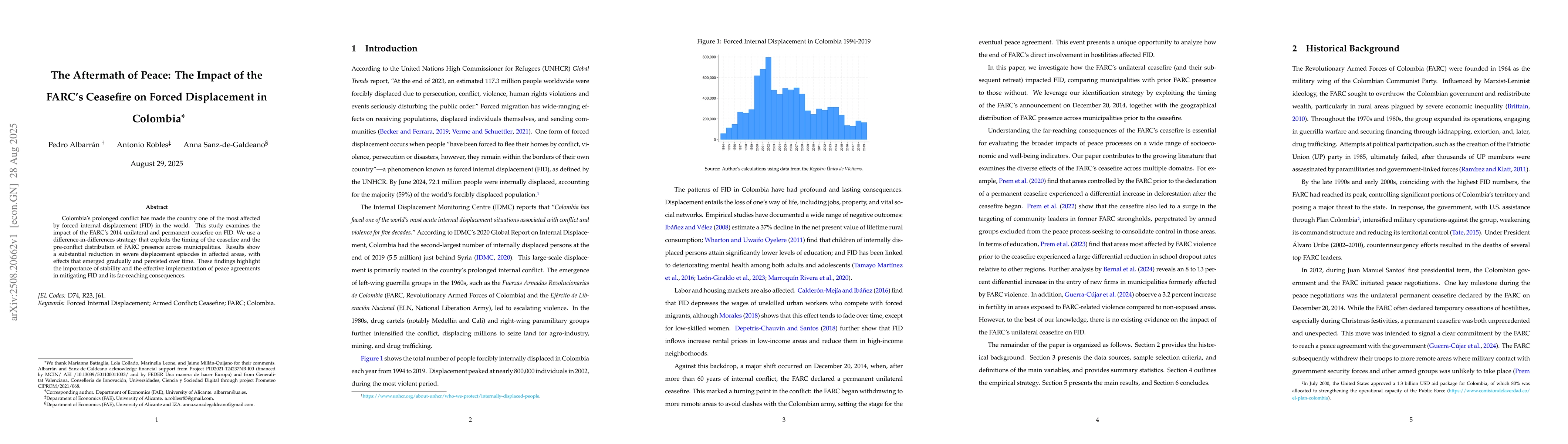 Colombia's prolonged conflict has made the country one of the most affected by forced internal displacement (FID) in the world. This study examines the impact of the FARC's 2014 unilateral and permanent ceasefire on FID. We use a difference-in-differences strategy that exploits the timing of the ceasefire and the pre-conflict distribution of FARC presence across municipalities. Results show a substantial reduction in severe displacement episodes in affected areas, with effects that emerged gradually and persisted over time. These findings highlight the importance of stability and the effective implementation of peace agreements in mitigating FID and its far-reaching consequences.