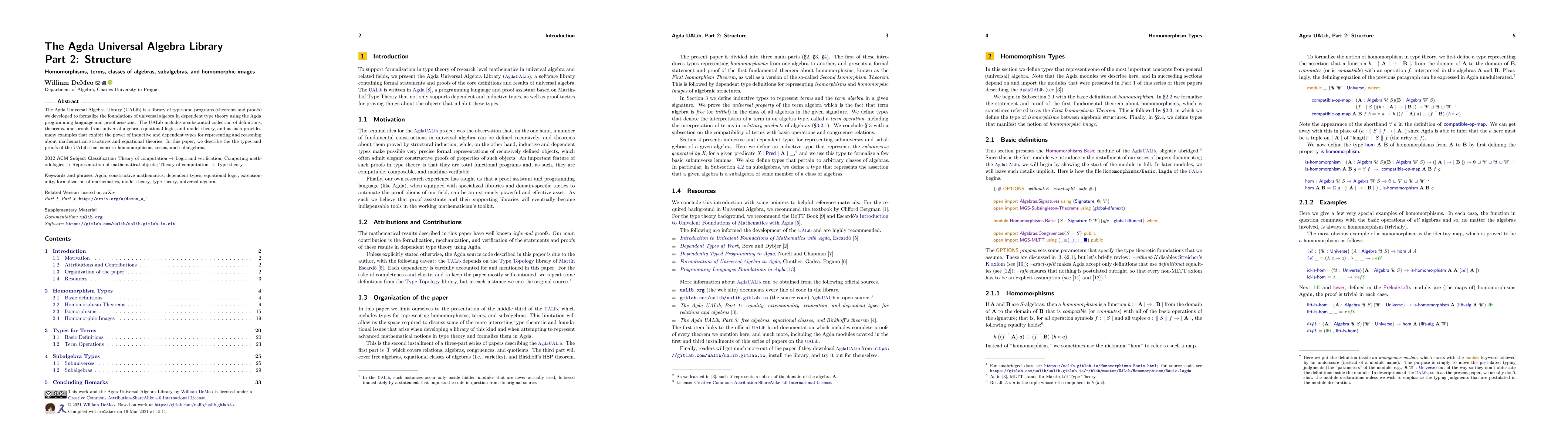 This paper details the Agda Universal Algebra Library (UALib), which formalizes universal algebra foundations using dependent type theory in the Agda language. It focuses on the types and proofs related to homomorphisms, terms, and subalgebras, showcasing the power of inductive and dependent types.