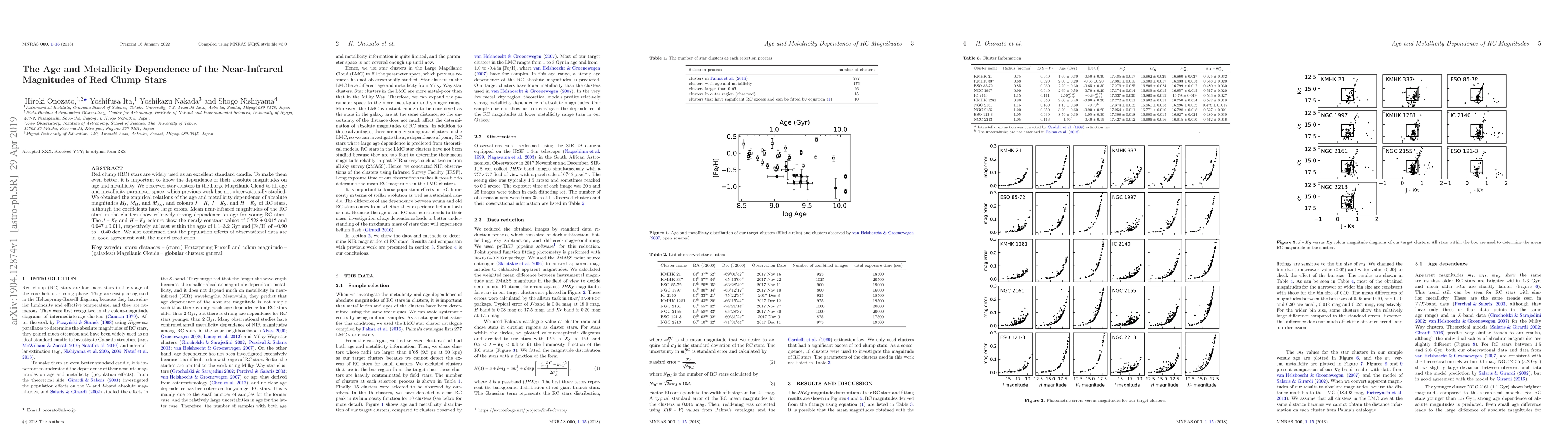 This study investigates the age and metallicity dependence of red clump stars' near-infrared magnitudes in the Large Magellanic Cloud, revealing strong age dependence in young RC stars and nearly constant colours $J - K_{S}$ and $H - K_{S}$ within specific age and metallicity ranges. The findings improve the precision of RC stars as standard candles.