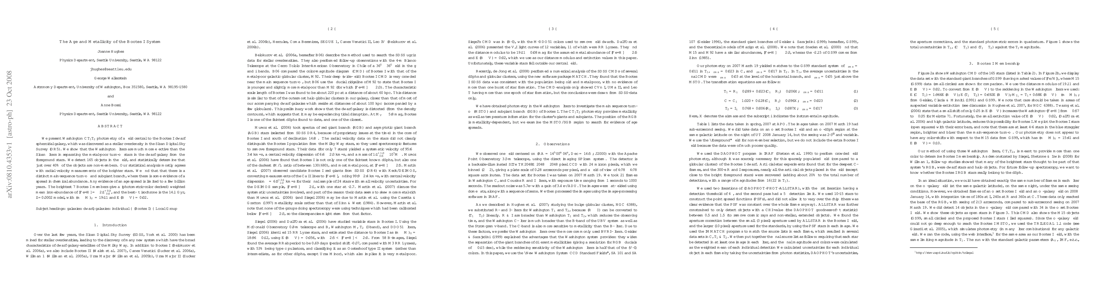We present Washington photometry of a field central to the Bootes I dwarf spheroidal galaxy, which was discovered as a stellar overdensity in the Sloan Digital Sky Survey (DR5). We show that the Washington filters are much more effective than the Sloan filters in separating the metal-poor turn-off stars in the dwarf galaxy from the foreground stars. We detect 165 objects in the field, and statistically determine that just over 40% of the objects are non-members. Our statistical analysis mostly agrees with radial velocity measurements of the brighter stars. We find that that there is a distinct main-sequence turn-off and subgiant branch, where there is some evidence of a spread in chemical abundance. Any evidence of an age spread is limited to a few billion years. The brightest 7 Bootes I members give a (photometric-color derived) weighted mean iron-abundance of [Fe/H]=-2.1+/-0.4, and the best-fit isochrone is the 14.1 Gyr, Z=0.0002 model, with DM=19.11 and E(B-V)=0.02.