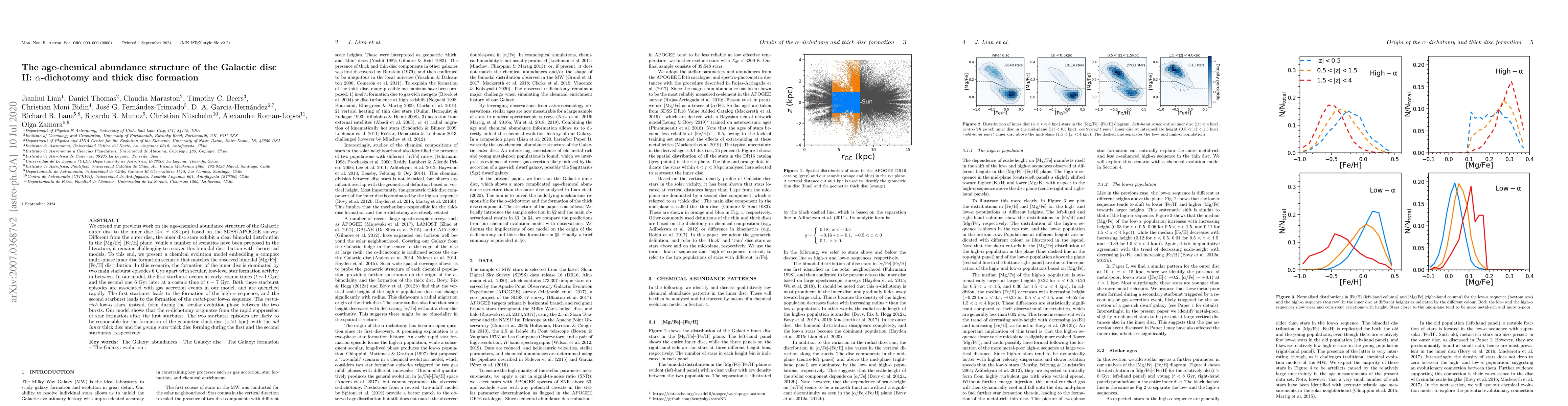 This paper explores the complex formation history of the inner Galactic disc (4 < r < 8 kpc) using data from the SDSS/APOGEE survey, revealing a bimodal distribution in the [Mg/Fe]-[Fe/H] plane. The authors propose a chemical evolution model featuring two main starburst episodes separated by 6 Gyr, which explains the observed $\alpha$-dichotomy and the formation of the thick disc.