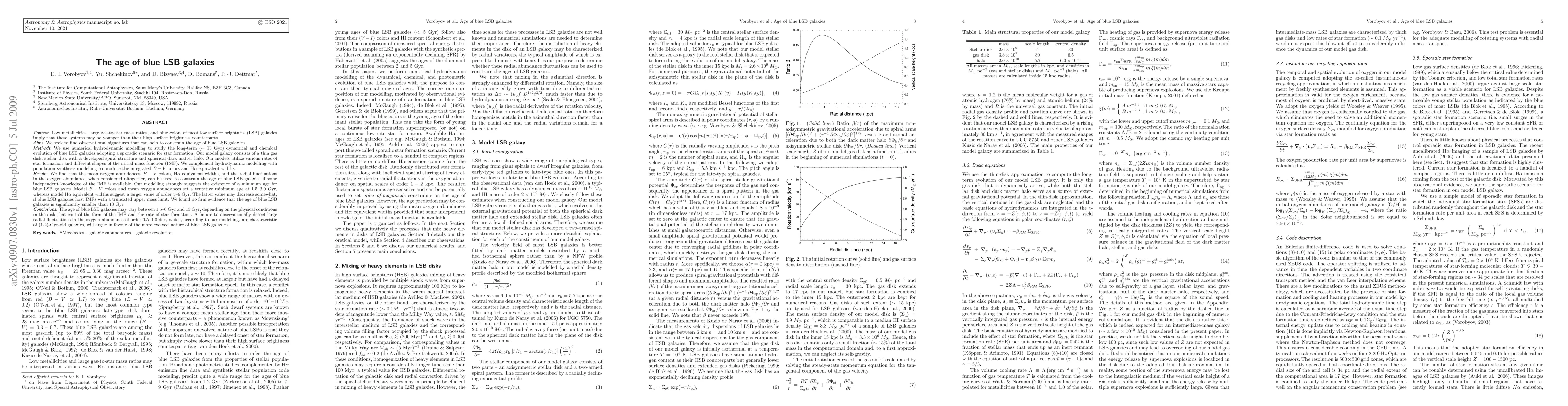 (Abridged). Low metallicities, large gas-to-star mass ratios, and blue colors of most low surface brightness (LSB) galaxies imply that these systems may be younger than their high surface brightness counterparts. We seek to find observational signatures that can help to constrain the age of blue LSB galaxies. We use numerical hydrodynamic modelling to study the long-term (~13 Gyr) dynamical and chemical evolution of blue LSB galaxies adopting a sporadic scenario for star formation. Our models utilize various rates of star formation and different shapes of the initial mass function (IMF). We complement hydrodynamic modelling with population synthesis modelling to produce the integrated B-V colors and Halpha equivalent widths (EW(Ha)). We find that the mean oxygen abundances, B-V colors, EW(Ha), and the radial fluctuations in the oxygen abundance, when considered altogether, can be used to constrain the age of blue LSB galaxies if some independent knowledge of the IMF is available. Our modelling strongly suggests the existence of a minimum age for blue LSB galaxies. Model B-V colors and mean oxygen abundances set a tentative minimum age at 1.5-3.0 Gyr, whereas model EW(Ha) suggest a larger value of order 5-6 Gyr. The latter value may decrease somewhat, if blue LSB galaxies host IMFs with a truncated upper mass limit. We found no firm evidence that the age of blue LSB galaxies is significantly smaller than 13 Gyr.