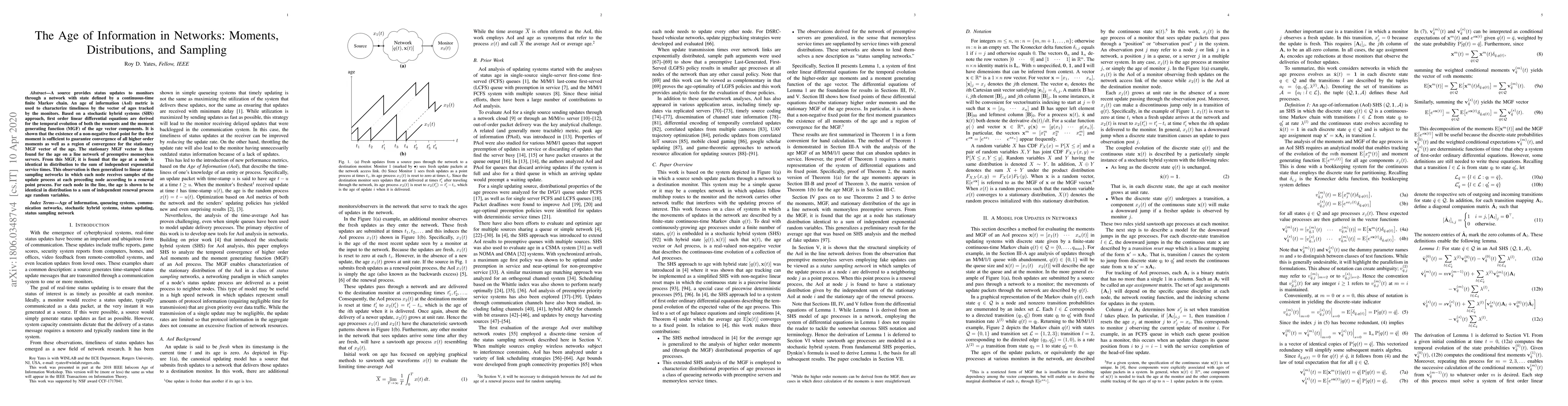 A source provides status updates to monitors through a network with state defined by a continuous-time finite Markov chain. An age of information (AoI) metric is used to characterize timeliness by the vector of ages tracked by the monitors. Based on a stochastic hybrid systems (SHS) approach, first order linear differential equations are derived for the temporal evolution of both the moments and the moment generating function (MGF) of the age vector components. It is shown that the existence of a non-negative fixed point for the first moment is sufficient to guarantee convergence of all higher order moments as well as a region of convergence for the stationary MGF vector of the age. The stationary MGF vector is then found for the age on a line network of preemptive memoryless servers. From this MGF, it is found that the age at a node is identical in distribution to the sum of independent exponential service times. This observation is then generalized to linear status sampling networks in which each node receives samples of the update process at each preceding node according to a renewal point process. For each node in the line, the age is shown to be identical in distribution to a sum of independent renewal process age random variables.