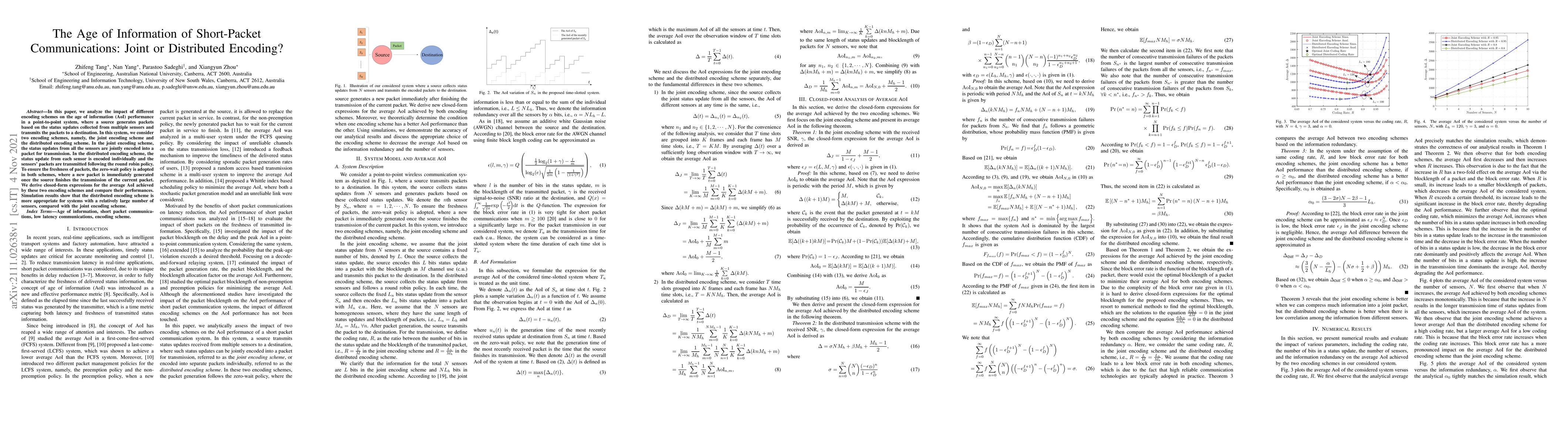 This paper compares the age of information (AoI) performance of joint and distributed encoding schemes in short-packet communications. It finds that the distributed scheme is more effective for systems with many sensors, while the joint scheme performs better in smaller systems.