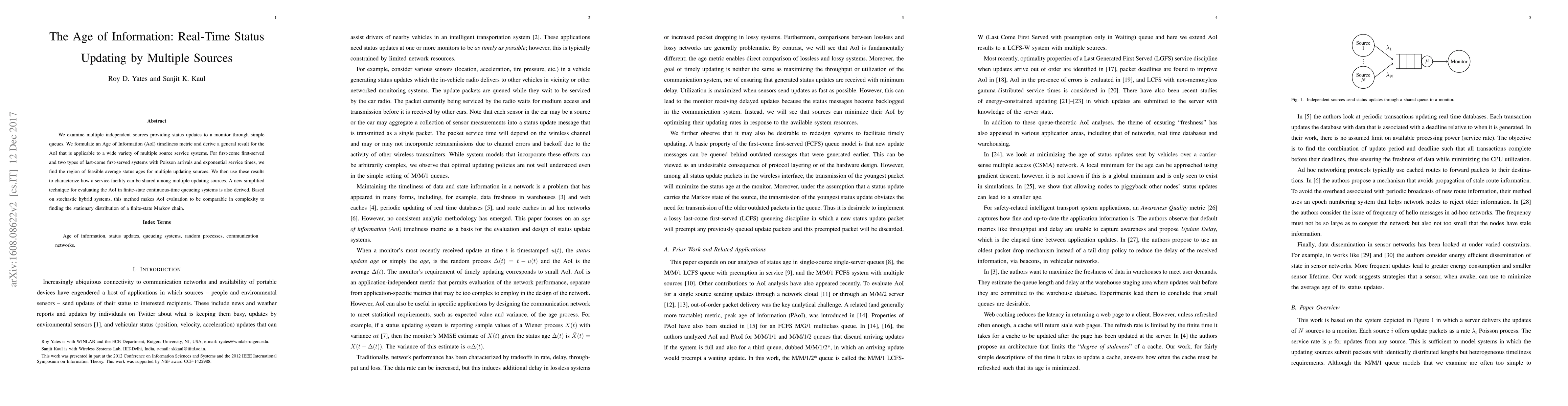 This paper develops a metric called Age of Information (AoI) to measure the timeliness of status updates from multiple independent sources. It derives a general result for AoI applicable to various service systems, and provides feasible average status ages for different updating systems, introducing a simplified technique for evaluating AoI in finite-state continuous-time queueing systems.