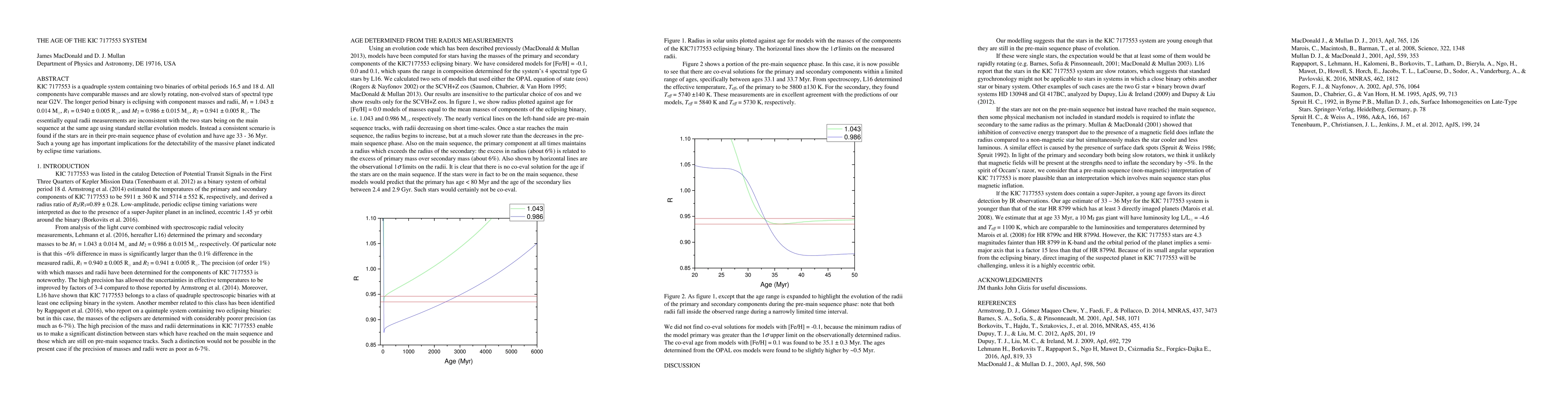KIC 7177553 is a quadruple system containing two binaries of orbital periods 16.5 and 18 d. All components have comparable masses and are slowly rotating, non-evolved stars of spectral type near G2V. The longer period binary is eclipsing with component masses and radii, M1 = 1.043 +/- 0.014 M_sun, R1 = 0.940 +/- 0.005 R_sun, and M2 = 0.986 +/- 0.015 M_sun, R2 = 0.941 +/- 0.005 R_sun. The essentially equal radii measurements are inconsistent with the two stars being on the main sequence at the same age using standard stellar evolution models. Instead a consistent scenario is found if the stars are in their pre-main sequence phase of evolution and have age 33 - 36 Myr. Such a young age has important implications for the detectability of the massive planet indicated by eclipse time variations.