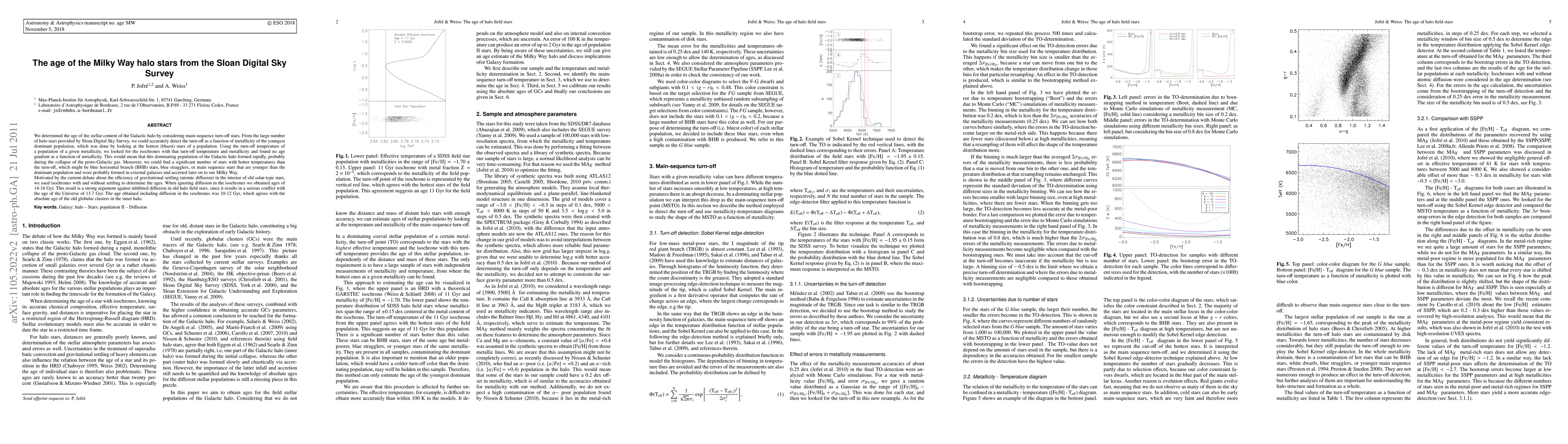 This study determined the age of the Milky Way halo stars using Sloan Digital Sky Survey data, identifying the main-sequence turn-off to estimate ages of 14-16 Gyr without diffusion, and 10-12 Gyr with diffusion, indicating a rapid formation during the proto-Galactic collapse.