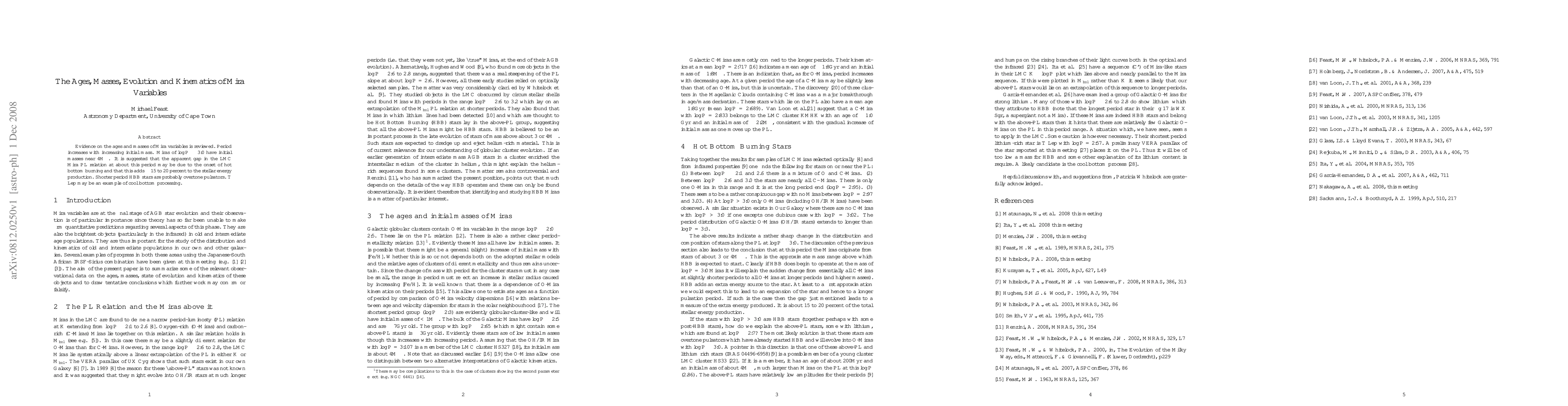 Evidence on the ages and masses of Mira variables is reviewed. Period increases with increasing initial mass. Miras of logP about 3.0 have initial masses of near 4 solar masses. It is suggestd that the apparent gap in the LMC PL relation at about this period may be due to the onset of hot bottom burning and that this adds about 15 to 20 percent to the stellar energy production. Shorter period HBB stars are probably overtone pulsators. T Lep may be an example of cool bottom processing.