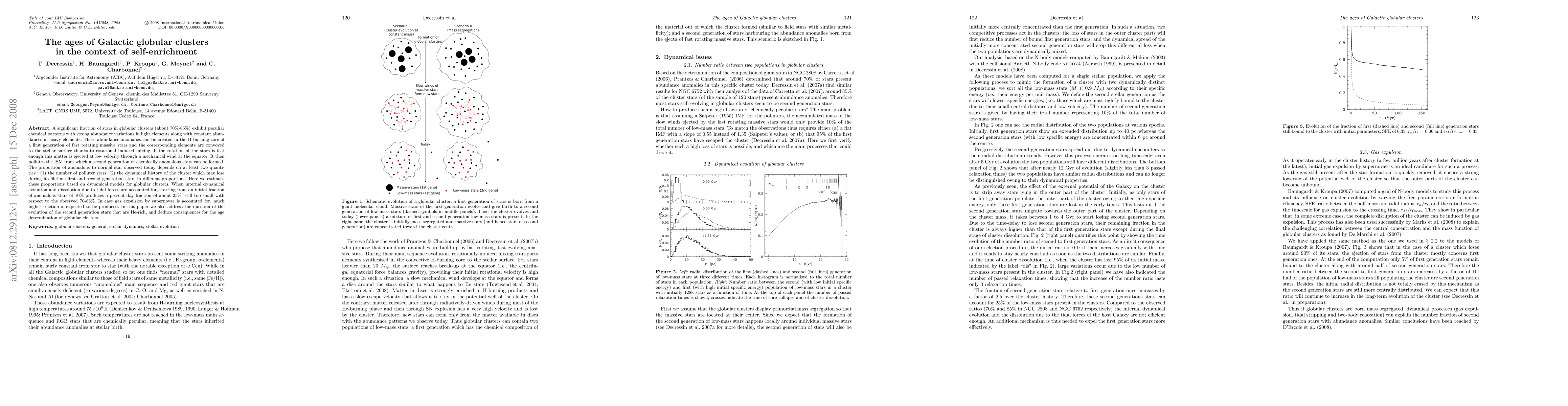 A significant fraction of stars in globular clusters (about 70%-85%) exhibit peculiar chemical patterns with strong abundance variations in light elements along with constant abundances in heavy elements. These abundance anomalies can be created in the H-burning core of a first generation of fast rotating massive stars and the corresponding elements are convoyed to the stellar surface thanks to rotational induced mixing. If the rotation of the stars is fast enough this matter is ejected at low velocity through a mechanical wind at the equator. It then pollutes the ISM from which a second generation of chemically anomalous stars can be formed. The proportion of anomalous to normal star observed today depends on at least two quantities : (1) the number of polluter stars; (2) the dynamical history of the cluster which may lose during its lifetime first and second generation stars in different proportions. Here we estimate these proportions based on dynamical models for globular clusters. When internal dynamical evolution and dissolution due to tidal forces are accounted for, starting from an initial fraction of anomalous stars of 10% produces a present day fraction of about 25%, still too small with respect to the observed 70-85%. In case gas expulsion by supernovae is accounted for, much higher fraction is expected to be produced. In this paper we also address the question of the evolution of the second generation stars that are He-rich, and deduce consequences for the age determination of globular clusters.