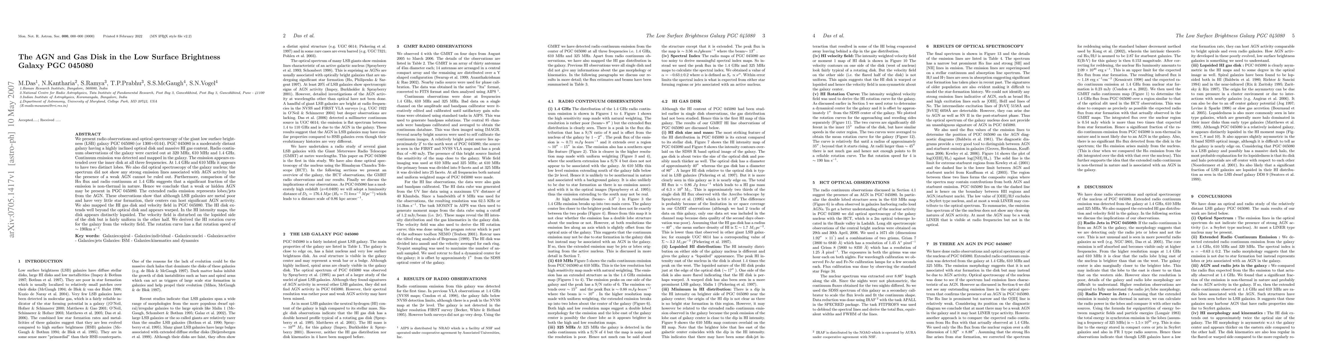We present radio observations and optical spectroscopy of the giant low surface brightness (LSB) galaxy PGC 045080 (or 1300+0144). PGC 045080 is a moderately distant galaxy having a highly inclined optical disk and massive HI gas content. Radio continuum observations of the galaxy were carried out at 320 MHz, 610 MHz and 1.4 GHz. Continuum emission was detected and mapped in the galaxy. The emission appears extended over the inner disk at all three frequencies. At 1.4 GHz and 610 MHz it appears to have two distinct lobes. We also did optical spectroscopy of the galaxy nucleus; the spectrum did not show any strong emission lines associated with AGN activity but the presence of a weak AGN cannot be ruled out. Furthermore, comparison of the H$\alpha$ flux and radio continuum at 1.4 GHz suggests that a significant fraction of the emission is non-thermal in nature. Hence we conclude that a weak or hidden AGN may be present in PGC 045080. The extended radio emission represents lobes/jets from the AGN. These observations show that although LSB galaxies are metal poor and have very little star formation, their centers can host significant AGN activity. We also mapped the HI gas disk and velocity field in PGC 045080. The HI disk extends well beyond the optical disk and appears warped. In the HI intensity maps, the disk appears distinctly lopsided. The velocity field is disturbed on the lopsided side of the disk but is fairly uniform in the other half. We derived the HI rotation curve for the galaxy from the velocity field. The rotation curve has a flat rotation speed of ~ 190 km/s.