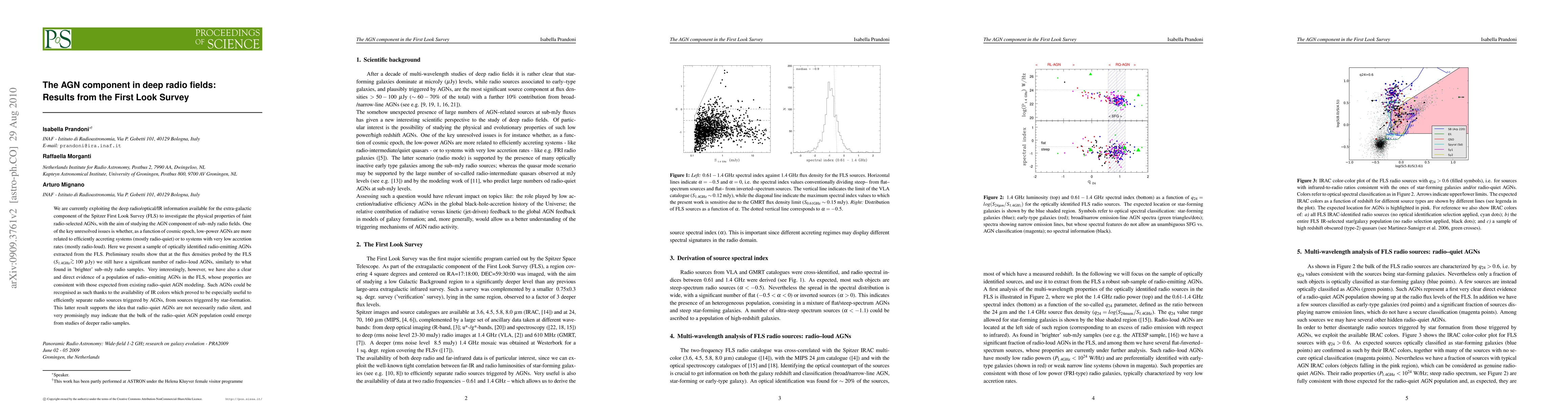 We are currently exploiting the deep radio/optical/IR information available for the extra-galactic component of the Spitzer First Look Survey (FLS) to investigate the physical properties of faint radio-selected AGNs, with the aim of studying the AGN component of sub-mJy radio fields. One of the key unresolved issues is whether, as a function of cosmic epoch, low-power AGNs are more related to efficiently accreting systems (mostly radio-quiet) or to systems with very low accretion rates (mostly radio-loud). Here we present a sample of optically identified radio-emitting AGNs extracted from the FLS. Preliminary results show that at the flux densities probed by the FLS (S(1.4 GHz)> 100 microJy) we still have a significant number of radio-loud AGNs, similarly to what found in 'brighter' sub-mJy radio samples. Very interestingly, however, we have also a clear and direct evidence of a population of radio-emitting AGNs in the FLS, whose properties are consistent with those expected from existing radio-quiet AGN modeling. Such AGNs could be recognised as such thanks to the availability of IR colors which proved to be especially useful to efficiently separate radio sources triggered by AGNs, from sources triggered by star-formation. This latter result supports the idea that radio-quiet AGNs are not necessarily radio silent, and very promisingly may indicate that the bulk of the radio-quiet AGN population could emerge from studies of deeper radio samples.