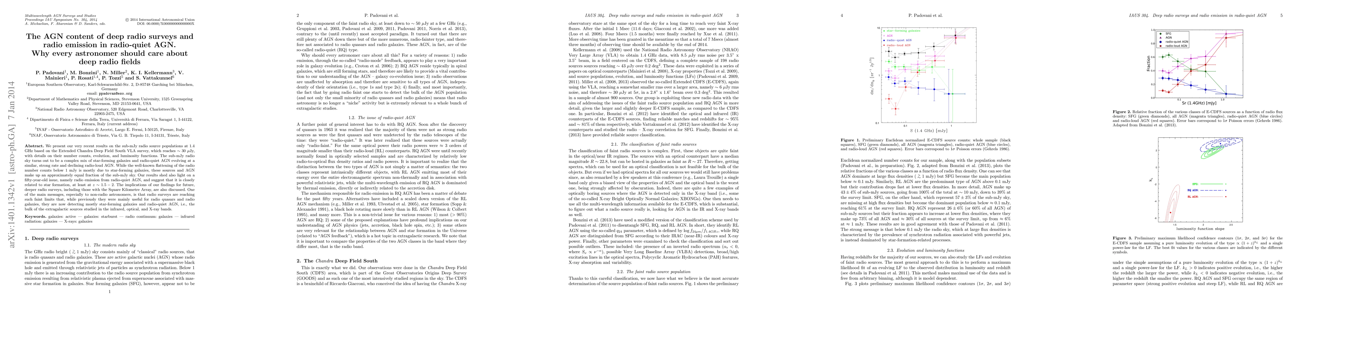 We present our very recent results on the sub-mJy radio source populations at 1.4 GHz based on the Extended Chandra Deep Field South VLA survey, which reaches ~ 30 {\mu}Jy, with details on their number counts, evolution, and luminosity functions. The sub-mJy radio sky turns out to be a complex mix of star-forming galaxies and radio-quiet AGN evolving at a similar, strong rate and declining radio-loud AGN. While the well-known flattening of the radio number counts below 1 mJy is mostly due to star-forming galaxies, these sources and AGN make up an approximately equal fraction of the sub-mJy sky. Our results shed also light on a fifty-year-old issue, namely radio emission from radio-quiet AGN, and suggest that it is closely related to star formation, at least at z ~ 1.5 - 2. The implications of our findings for future, deeper radio surveys, including those with the Square Kilometre Array, are also discussed. One of the main messages, especially to non-radio astronomers, is that radio surveys are reaching such faint limits that, while previously they were mainly useful for radio quasars and radio galaxies, they are now detecting mostly star-forming galaxies and radio-quiet AGN, i.e., the bulk of the extragalactic sources studied in the infrared, optical, and X-ray bands.