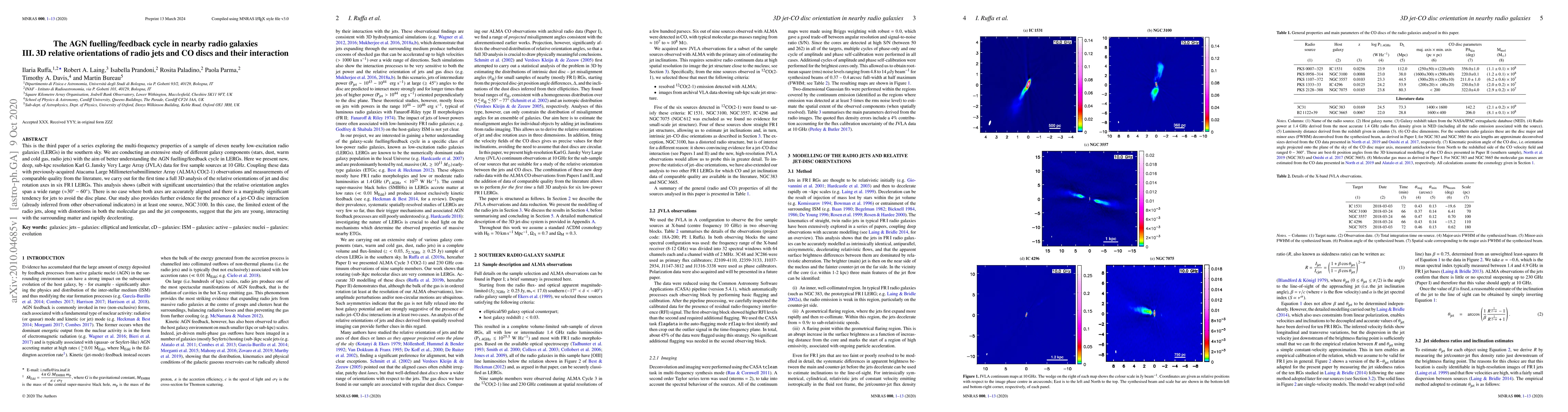 This is the third paper of a series exploring the multi-frequency properties of a sample of eleven nearby low-excitation radio galaxies (LERGs) in the southern sky. We are conducting an extensive study of different galaxy components (stars, dust, warm and cold gas, radio jets) with the aim of better understanding the AGN fuelling/feedback cycle in LERGs. Here we present new, deep, sub-kpc resolution Karl G. Jansky Very Large Array (JVLA) data for five sample sources at 10 GHz. Coupling these data with previously-acquired Atacama Large Millimeter/submillimeter Array (ALMA) CO(2-1) observations and measurements of comparable quality from the literature, we carry out for the first time a full 3D analysis of the relative orientations of jet and disc rotation axes in six FR I LERGs. This analysis shows (albeit with significant uncertainties) that the relative orientation angles span a wide range ($\approx$30$^{\circ}-60^{\circ}$). There is no case where both axes are accurately aligned and there is a marginally significant tendency for jets to avoid the disc plane. Our study also provides further evidence for the presence of a jet-CO disc interaction (already inferred from other observational indicators) in at least one source, NGC 3100. In this case, the limited extent of the radio jets, along with distortions in both the molecular gas and the jet components, suggest that the jets are young, interacting with the surrounding matter and rapidly decelerating.