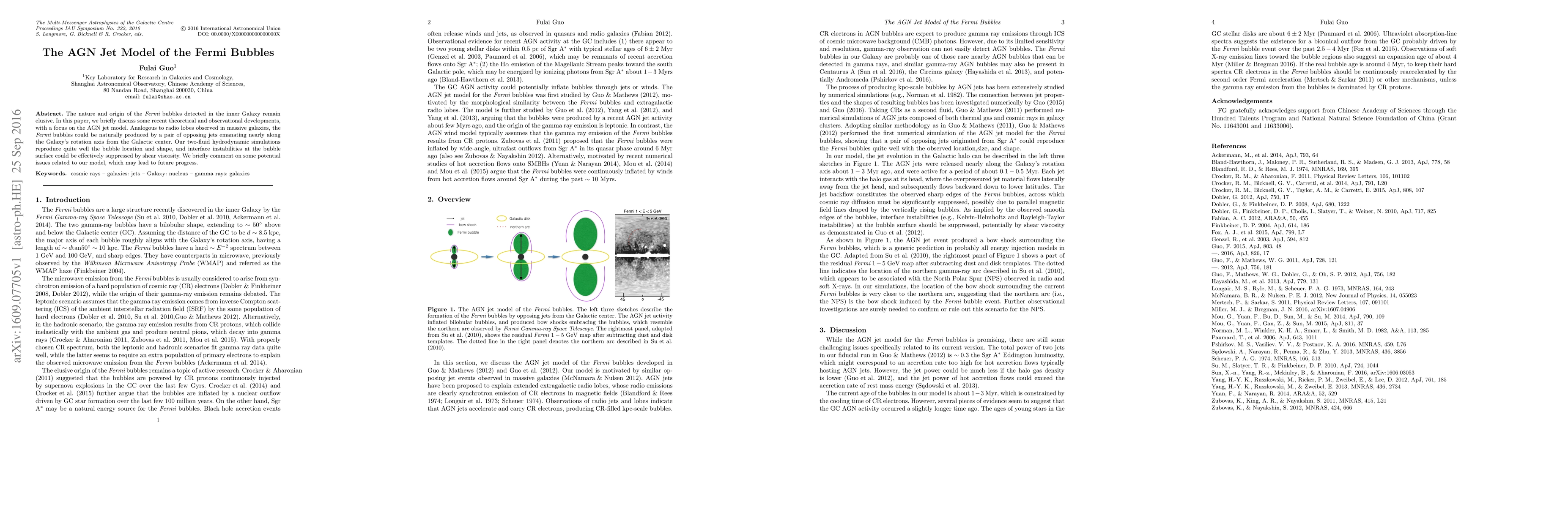 The nature and origin of the Fermi bubbles detected in the inner Galaxy remain elusive. In this paper, we briefly discuss some recent theoretical and observational developments, with a focus on the AGN jet model. Analogous to radio lobes observed in massive galaxies, the Fermi bubbles could be naturally produced by a pair of opposing jets emanating nearly along the Galaxy's rotation axis from the Galactic center. Our two-fluid hydrodynamic simulations reproduce quite well the bubble location and shape, and interface instabilities at the bubble surface could be effectively suppressed by shear viscosity. We briefly comment on some potential issues related to our model, which may lead to future progress.