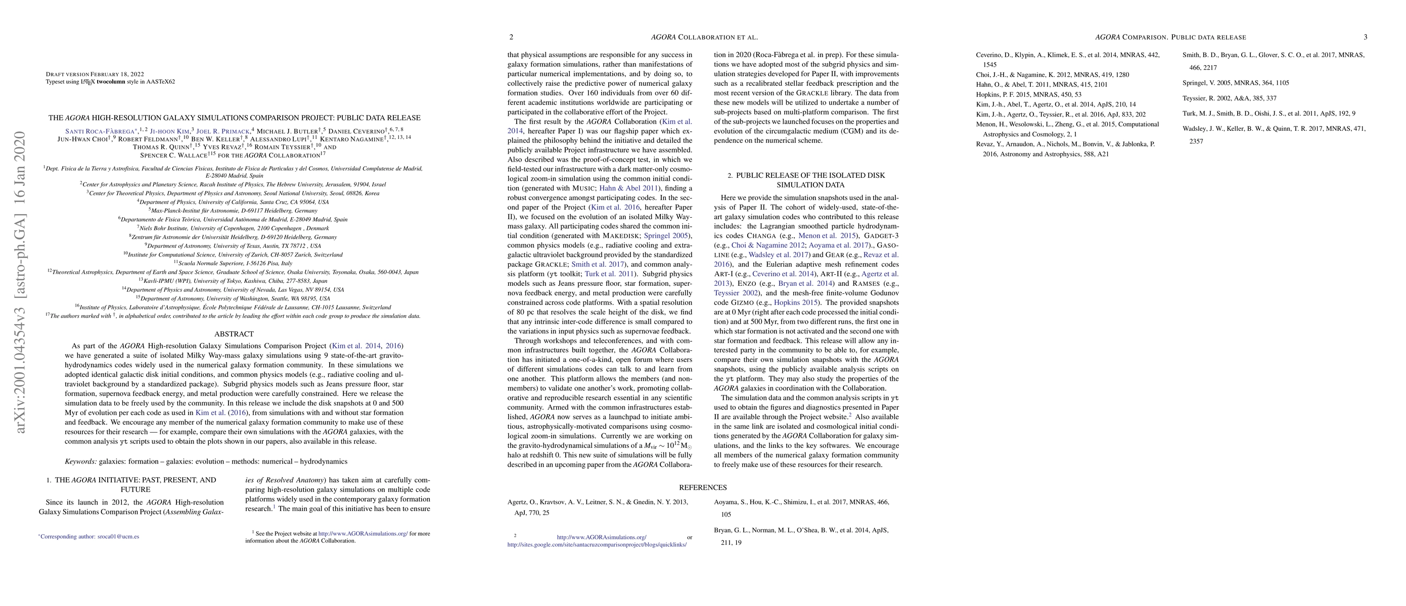 The AGORA High-resolution Galaxy Simulations Comparison Project has released a suite of Milky Way-mass galaxy simulations from nine gravito-hydrodynamics codes, with identical initial conditions and common physics models. The data includes snapshots at 0 and 500Myr, encouraging community research and comparison with the AGORA galaxies.