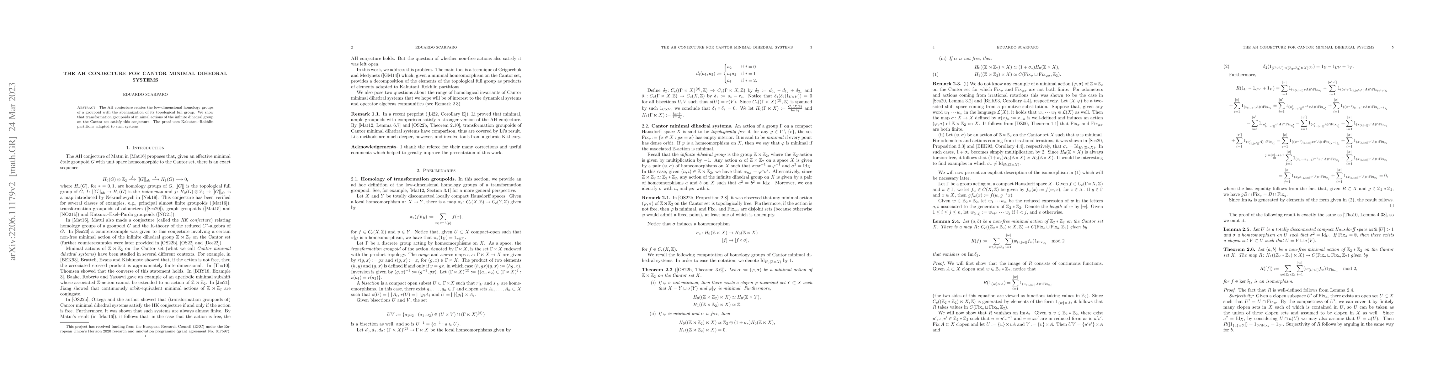 The AH conjecture links low-dimensional homology groups of a groupoid to its abelianization. This paper demonstrates that Cantor minimal dihedral systems satisfy the conjecture, utilizing Kakutani-Rokhlin partitions tailored to these systems.