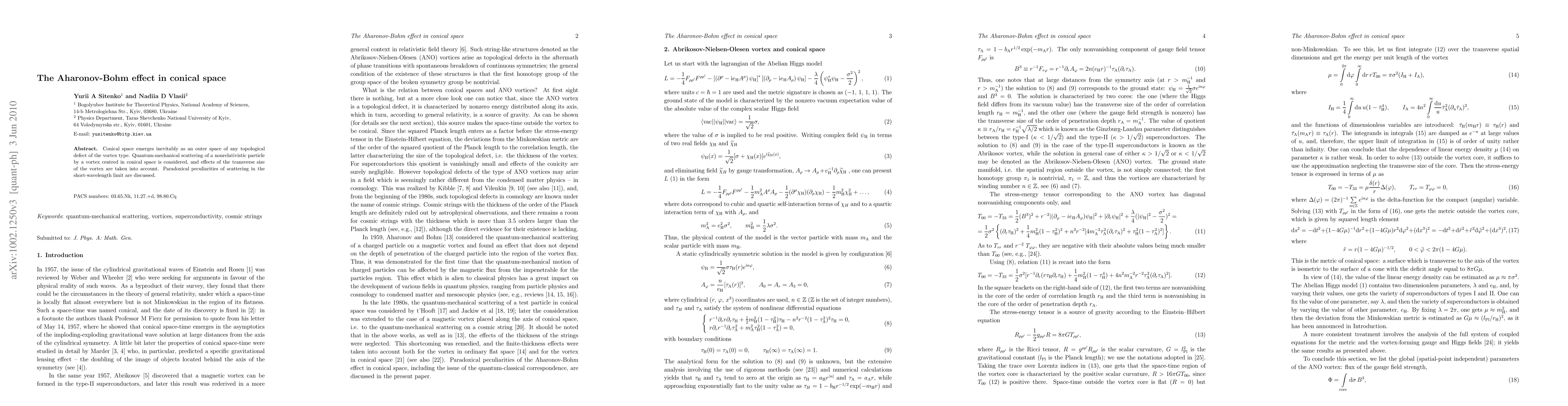 Conical space emerges inevitably as an outer space of any topological defect of the vortex type. Quantum-mechanical scattering of a nonrelativistic particle by a vortex centred in conical space is considered, and effects of the transverse size of the vortex are taken into account. Paradoxical peculiarities of scattering in the short-wavelength limit are discussed.