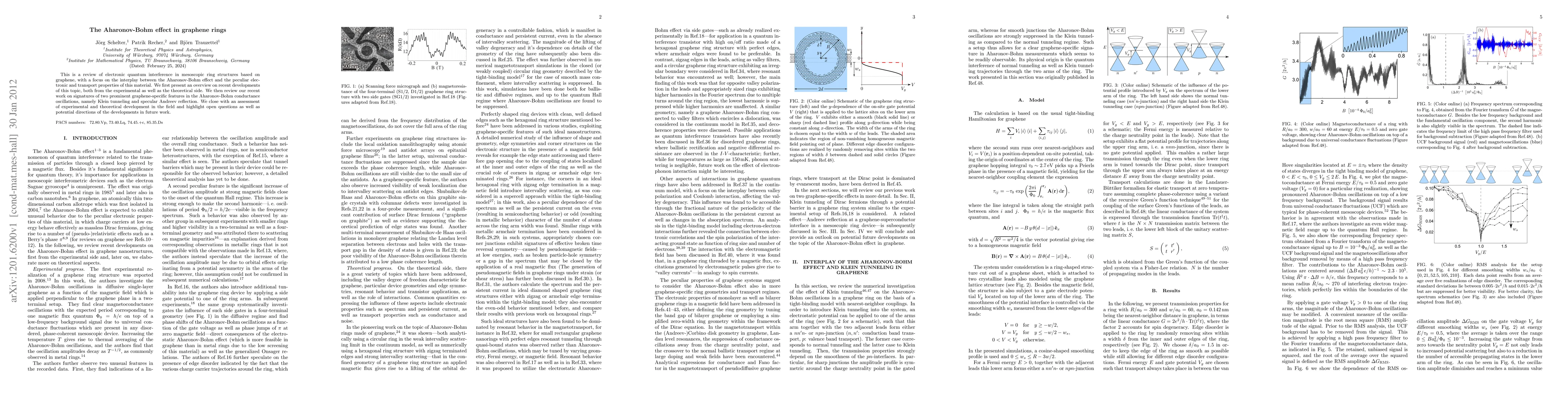 This is a review of electronic quantum interference in mesoscopic ring structures based on graphene, with a focus on the interplay between the Aharonov-Bohm effect and the peculiar electronic and transport properties of this material. We first present an overview on recent developments of this topic, both from the experimental as well as the theoretical side. We then review our recent work on signatures of two prominent graphene-specific features in the Aharonov-Bohm conductance oscillations, namely Klein tunneling and specular Andreev reflection. We close with an assessment of experimental and theoretical development in the field and highlight open questions as well as potential directions of the developments in future work.