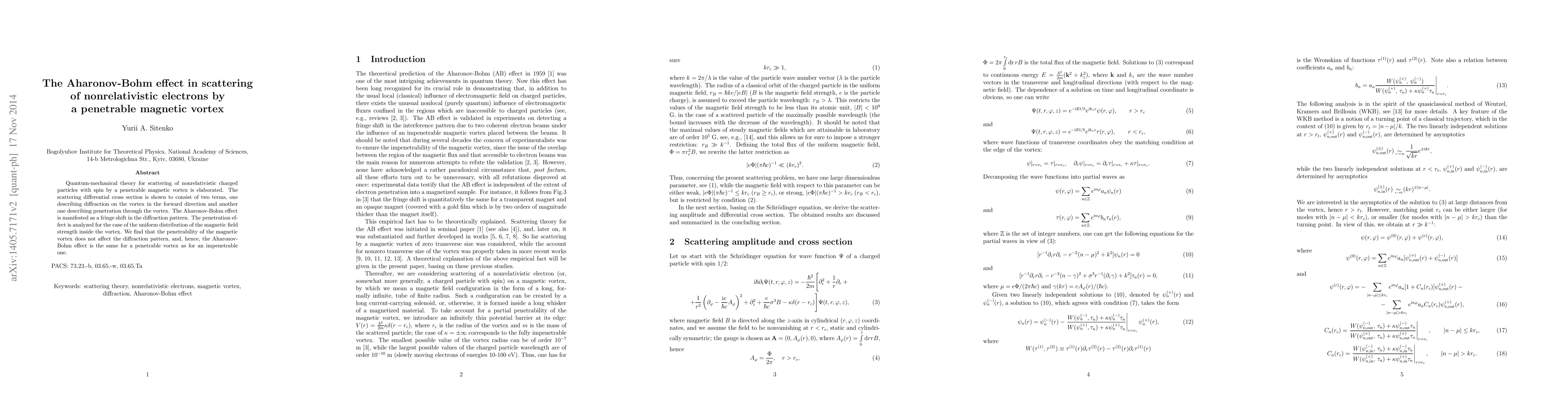 The paper develops a quantum theory for scattering of nonrelativistic charged particles by a penetrable magnetic vortex, showing the scattering differential cross section comprises diffraction and penetration terms. The Aharonov-Bohm effect is identified as a fringe shift in diffraction, with penetrability of the vortex not affecting the diffraction pattern or the Aharonov-Bohm effect.
