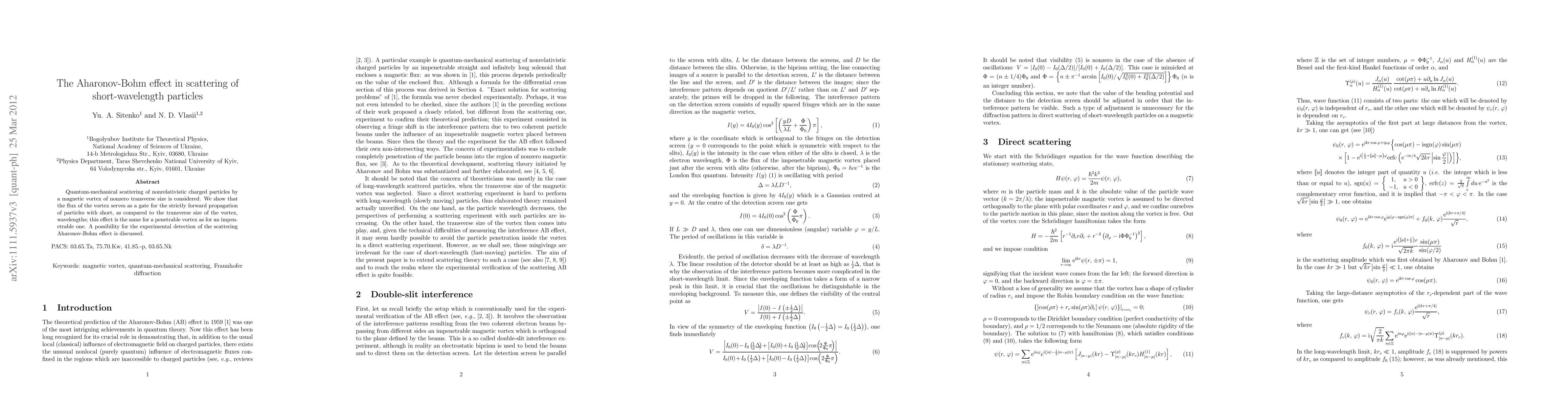 The paper investigates the Aharonov-Bohm effect in scattering of short-wavelength particles by a magnetic vortex, demonstrating that the vortex's flux influences forward propagation of these particles regardless of the vortex's penetrability. The study also explores the potential for experimental detection of this effect.