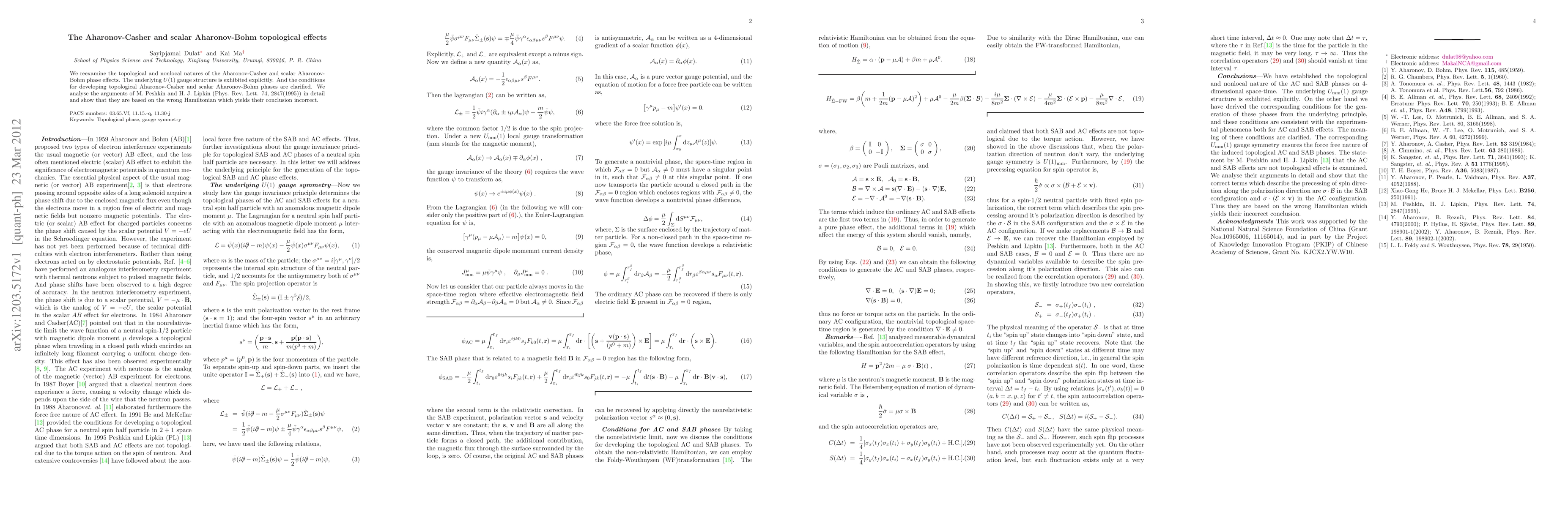 The paper explicitly exhibits the U(1) gauge structure underlying the Aharonov-Casher and scalar Aharonov-Bohm effects, clarifying conditions for developing topological phases and correcting previous misconceptions.