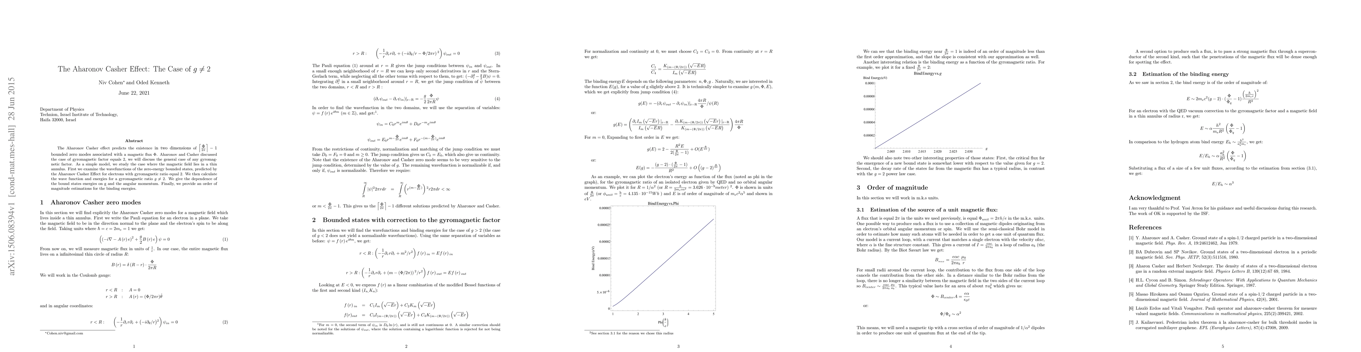 The Aharonov Casher effect predicts the existence in two dimensions of ceil(Phi/2pi) -1 bounded zero modes associated with a magnetic flux Phi. Aharonov and Casher discussed the case of gyromagnetic factor equals 2, we will discuss the general case of any gyromagnetic factor. As a simple model, we study the case where the magnetic field lies in a thin annulus. First we examine the wavefunctions of the zero-energy bounded states, predicted by the Aharonov Casher Effect for electrons with gyromagnetic ratio equal 2. We then calculate the wave function and energies for a gyromagnetic ratio g not equal to 2. We give the dependence of the bound states energies on g and the angular momentum. Finally, we provide an order of magnitude estimations for the binding energies.