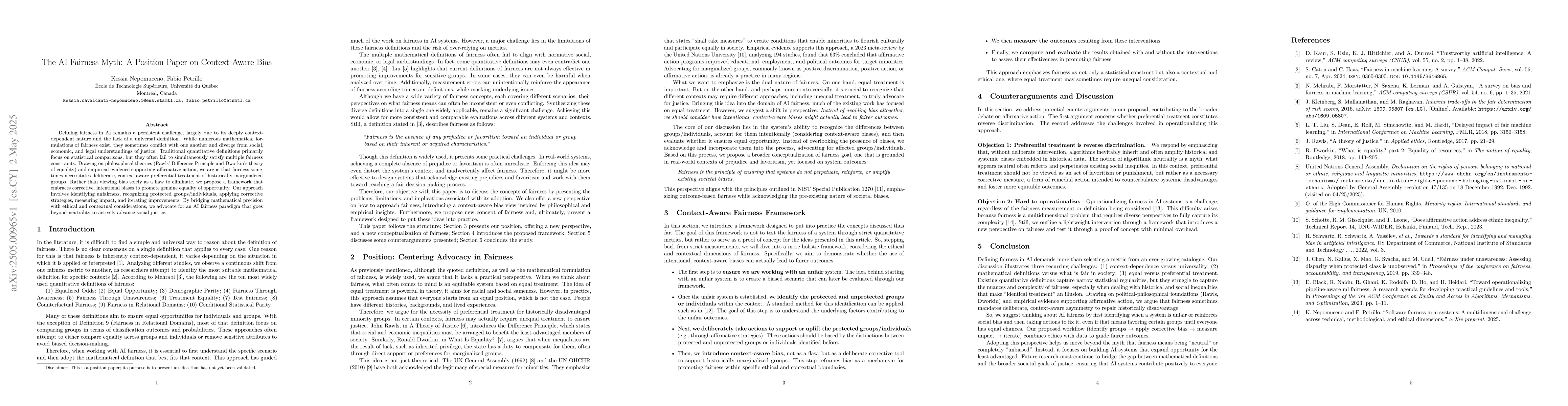 Defining fairness in AI remains a persistent challenge, largely due to its deeply context-dependent nature and the lack of a universal definition. While numerous mathematical formulations of fairness exist, they sometimes conflict with one another and diverge from social, economic, and legal understandings of justice. Traditional quantitative definitions primarily focus on statistical comparisons, but they often fail to simultaneously satisfy multiple fairness constraints. Drawing on philosophical theories (Rawls' Difference Principle and Dworkin's theory of equality) and empirical evidence supporting affirmative action, we argue that fairness sometimes necessitates deliberate, context-aware preferential treatment of historically marginalized groups. Rather than viewing bias solely as a flaw to eliminate, we propose a framework that embraces corrective, intentional biases to promote genuine equality of opportunity. Our approach involves identifying unfairness, recognizing protected groups/individuals, applying corrective strategies, measuring impact, and iterating improvements. By bridging mathematical precision with ethical and contextual considerations, we advocate for an AI fairness paradigm that goes beyond neutrality to actively advance social justice.