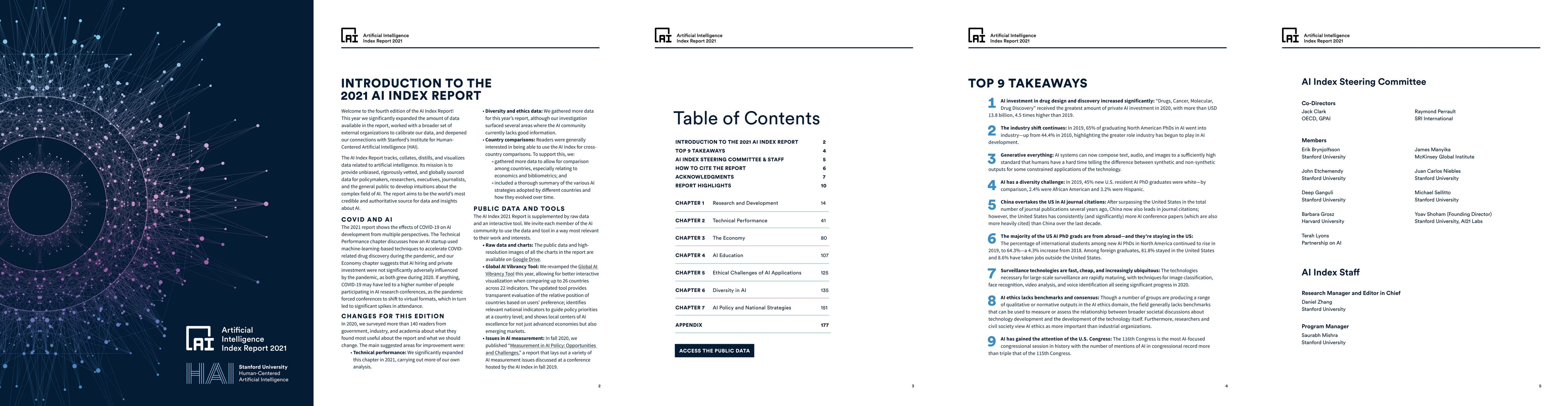 Welcome to the fourth edition of the AI Index Report. This year we significantly expanded the amount of data available in the report, worked with a broader set of external organizations to calibrate our data, and deepened our connections with the Stanford Institute for Human-Centered Artificial Intelligence (HAI). The AI Index Report tracks, collates, distills, and visualizes data related to artificial intelligence. Its mission is to provide unbiased, rigorously vetted, and globally sourced data for policymakers, researchers, executives, journalists, and the general public to develop intuitions about the complex field of AI. The report aims to be the most credible and authoritative source for data and insights about AI in the world.