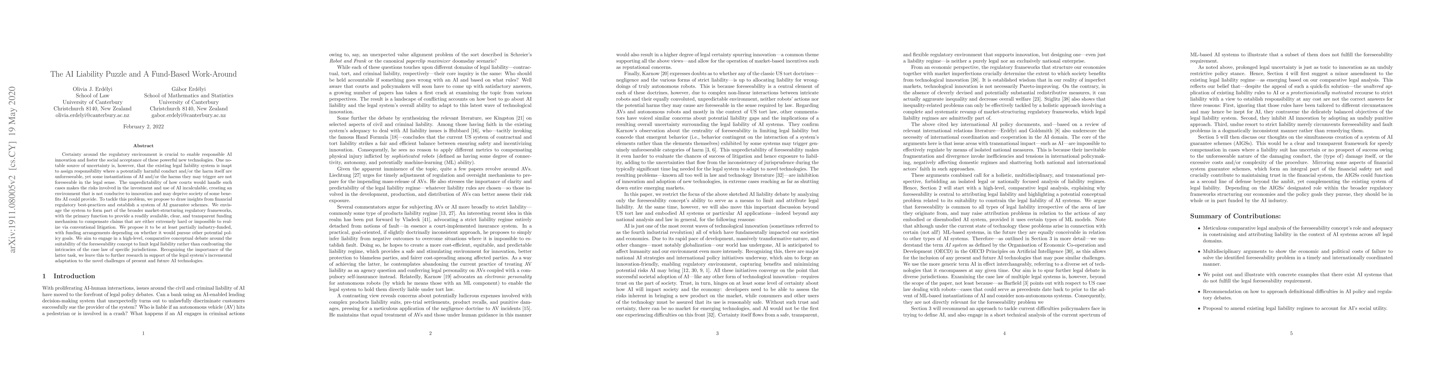 This paper addresses the regulatory uncertainty surrounding AI liability, arguing that current legal systems struggle to assign responsibility for unforeseeable AI harms. To mitigate this, the authors propose a fund-based guarantee scheme inspired by financial regulatory practices, aiming to provide a transparent, clear, and readily available funding mechanism for compensating unforeseeable AI-related damages.