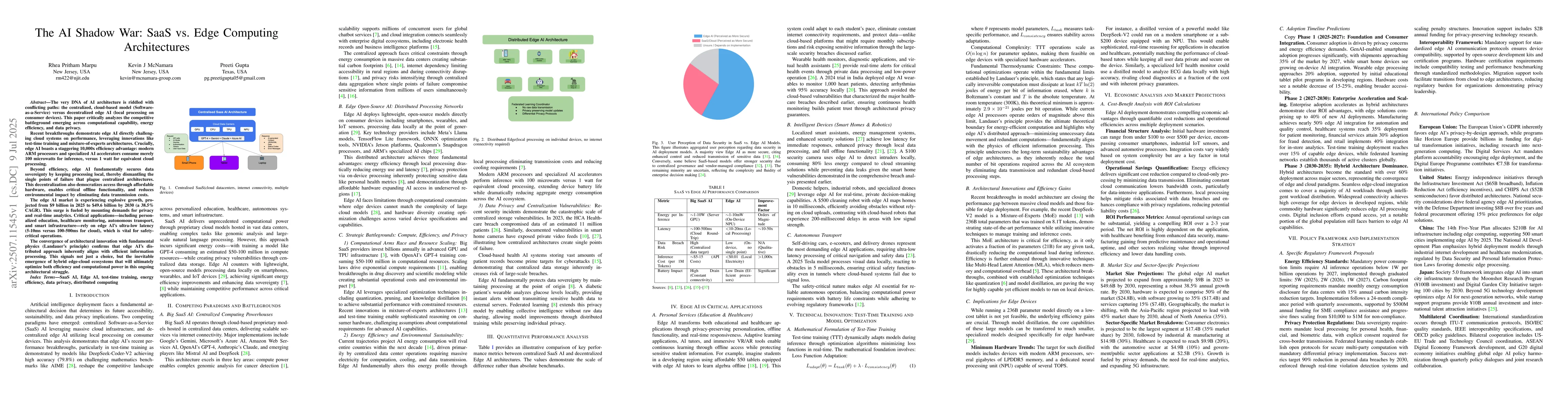 The very DNA of AI architecture presents conflicting paths: centralized cloud-based models (Software-as-a-Service) versus decentralized edge AI (local processing on consumer devices). This paper analyzes the competitive battleground across computational capability, energy efficiency, and data privacy. Recent breakthroughs show edge AI challenging cloud systems on performance, leveraging innovations like test-time training and mixture-of-experts architectures. Crucially, edge AI boasts a 10,000x efficiency advantage: modern ARM processors consume merely 100 microwatts forinference versus 1 watt for equivalent cloud processing. Beyond efficiency, edge AI secures data sovereignty by keeping processing local, dismantling single points of failure in centralized architectures. This democratizes access throughaffordable hardware, enables offline functionality, and reduces environmental impact by eliminating data transmission costs. The edge AI market projects explosive growth from $9 billion in 2025 to $49.6 billion by 2030 (38.5% CAGR), fueled by privacy demands and real-time analytics. Critical applications including personalized education, healthcare monitoring, autonomous transport, and smart infrastructure rely on edge AI's ultra-low latency (5-10ms versus 100-500ms for cloud). The convergence of architectural innovation with fundamental physics confirms edge AI's distributed approach aligns with efficient information processing, signaling the inevitable emergence of hybrid edge-cloud ecosystems.