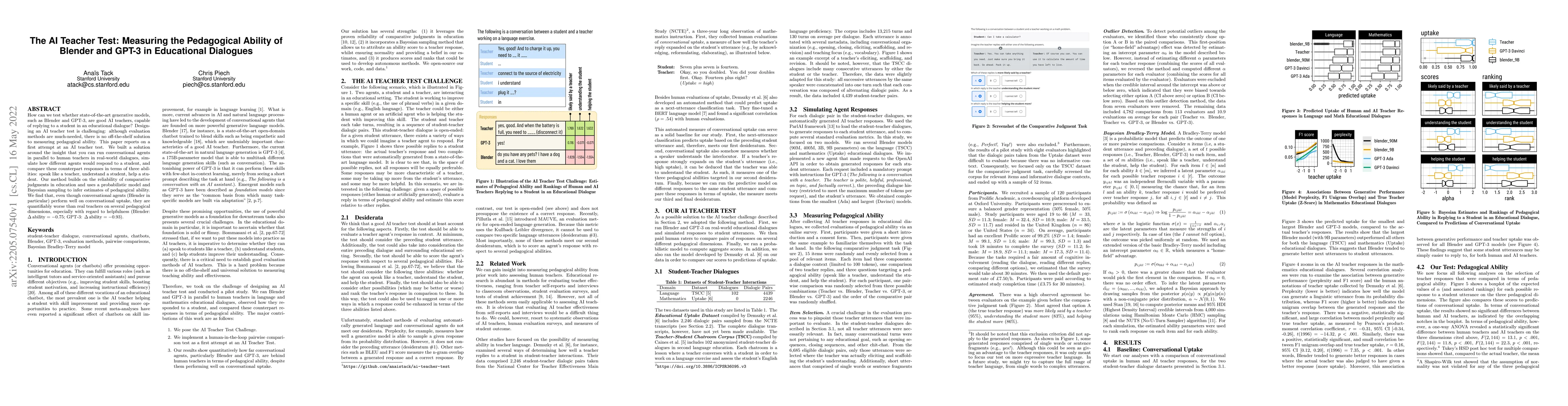 This paper proposes a novel AI teacher test to evaluate the pedagogical capabilities of generative models like Blender and GPT-3 in educational dialogues. The study finds that while these models perform well in conversational uptake, they significantly lag behind human teachers in terms of understanding and helping students.