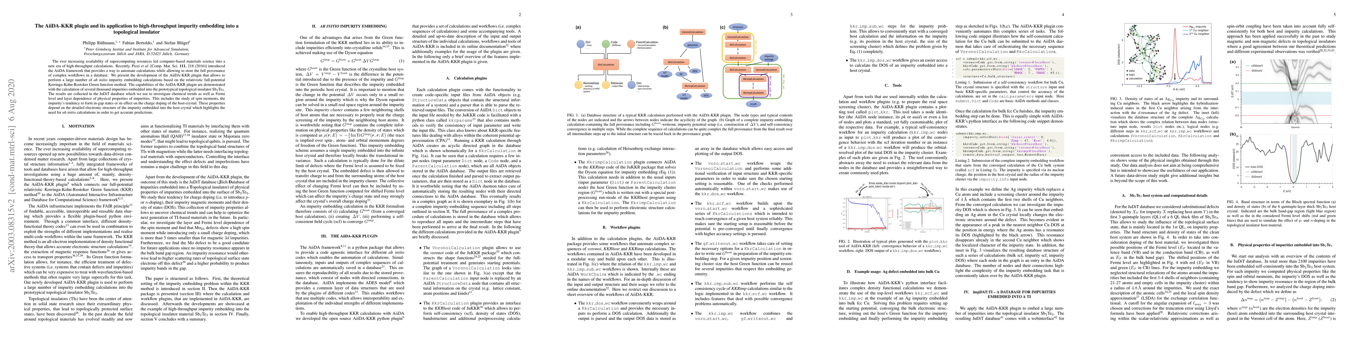The AiiDA-KKR plugin automates high-throughput ab initio impurity embedding calculations using the KKR method, enabling detailed studies of impurity effects in topological insulators like Sb2Te3. The results, stored in the JuDiT database, reveal chemical trends and physical properties influenced by impurity embedding.