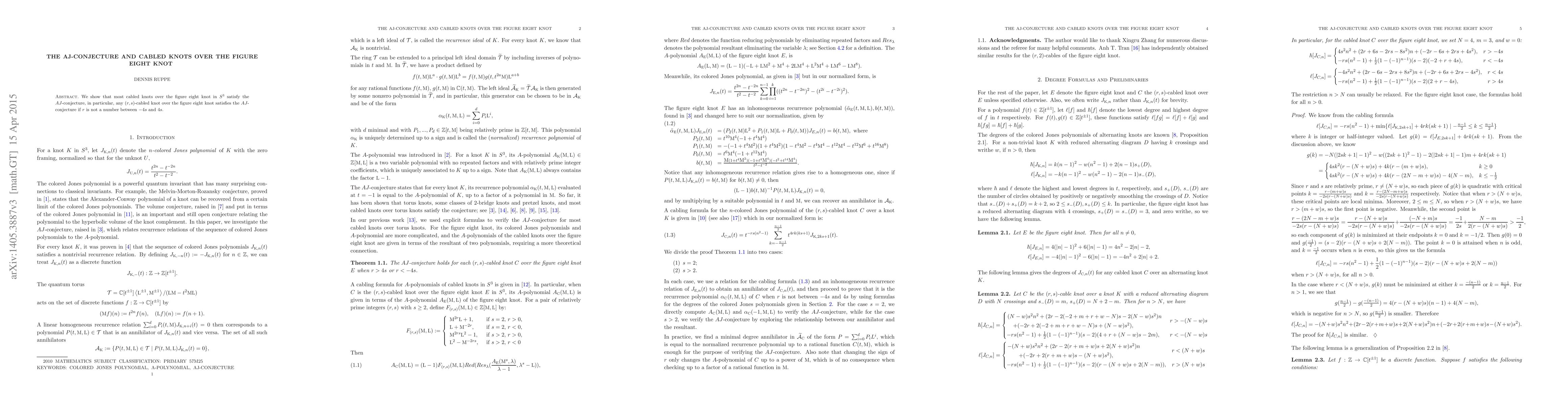 Summary: This paper demonstrates that most cabled knots over the figure eight knot in $S^3$ fulfill the AJ-conjecture, specifically when the $r$ value of the $(r,s)$-cable is outside the range of $-4s$ to $4s$. The AJ-conjecture is thereby validated for these knots under certain conditions.